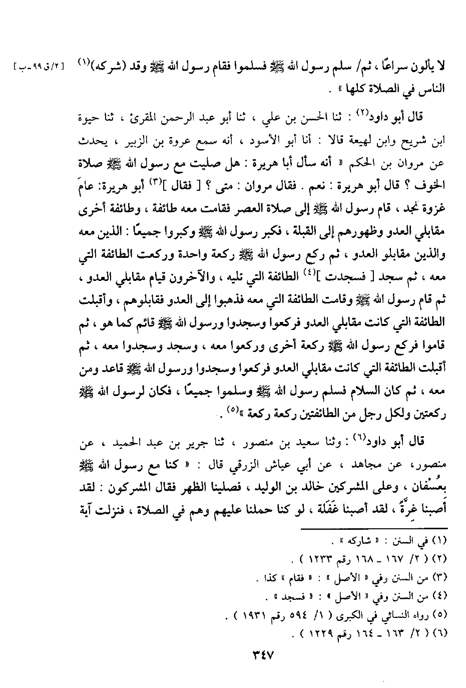 قَالَ أَبُو دَاوُد: ثَنَا الْحسن بن عَليّ، ثَنَا أَبُو عبد الرَّحْمَن الْمُقْرِئ، ثَنَا حَيْوَة ابْن شُرَيْح وَابْن لَهِيعَة قَالَا: أَنا أَبُو الْأسود، أَنه سمع عُرْوَة بن الزبير، يحدث عَن مَرْوَان بن الحكم " أَنه سَأَلَ أَبَا هُرَيْرَة: هَل صليت مَعَ رَسُول اللَّهِ - صَلَّى اللَّهُ عَلَيْهِ وَسَلَّم َ - صَلَاة الْخَوْف؟ قَالَ أَبُو هُرَيْرَة: نعم. فَقَالَ مَرْوَان: مَتى؟ [فَقَالَ] أَبُو هُرَيْرَة: عَام غَزْوَة نجد، قَامَ رَسُول اللَّهِ - صَلَّى اللَّهُ عَلَيْهِ وَسَلَّم َ - إِلَى صَلَاة الْعَصْر فَقَامَتْ مَعَه طَائِفَة، وَطَائِفَة أُخْرَى مقابلي الْعَدو وظهورهم إِلَى الْقبْلَة، فَكبر رَسُول اللَّهِ - صَلَّى اللَّهُ عَلَيْهِ وَسَلَّم َ - وَكَبرُوا جَمِيعًا: الَّذين مَعَه وَالَّذين مقابلو الْعَدو، ثمَّ ركع رَسُول اللَّهِ - صَلَّى اللَّهُ عَلَيْهِ وَسَلَّم َ - رَكْعَة وَاحِدَة وركعت الطَّائِفَة الَّتِي مَعَه، ثمَّ سجد [فسجدت] الطَّائِفَة الَّتِي تليه، وَالْآخرُونَ قيام مقابلي الْعَدو، ثمَّ قَامَ رَسُول اللَّهِ - صَلَّى اللَّهُ عَلَيْهِ وَسَلَّم َ - وَقَامَت الطَّائِفَة الَّتِي مَعَه فَذَهَبُوا إِلَى الْعَدو فقابلوهم، وَأَقْبَلت الطَّائِفَة الَّتِي كَانَت مقابلي الْعَدو فركعوا وسجدوا وَرَسُول اللَّهِ - صَلَّى اللَّهُ عَلَيْهِ وَسَلَّم َ - قَائِم كَمَا هُوَ، ثمَّ قَامُوا فَرَكَعَ رَسُول اللَّه - صَلَّى اللَّهُ عَلَيْهِ وَسَلَّم َ - رَكْعَة أُخْرَى وركعوا مَعَه، وَسجد وسجدوا مَعَه، ثمَّ أَقبلت الطَّائِفَة الَّتِي كَانَت مقابلي الْعَدو فركعوا وسجدوا وَرَسُول الله - صَلَّى اللَّهُ عَلَيْهِ وَسَلَّم َ - قَاعد وَمن مَعَه، ثمَّ كَانَ السَّلَام فَسلم رَسُول الله - صَلَّى اللَّهُ عَلَيْهِ وَسَلَّم َ - وسلموا جَمِيعًا، فَكَانَ لرَسُول الله - صَلَّى اللَّهُ عَلَيْهِ وَسَلَّم َ - رَكْعَتَيْنِ وَلكُل رجل من الطَّائِفَتَيْنِ رَكْعَة رَكْعَة ".