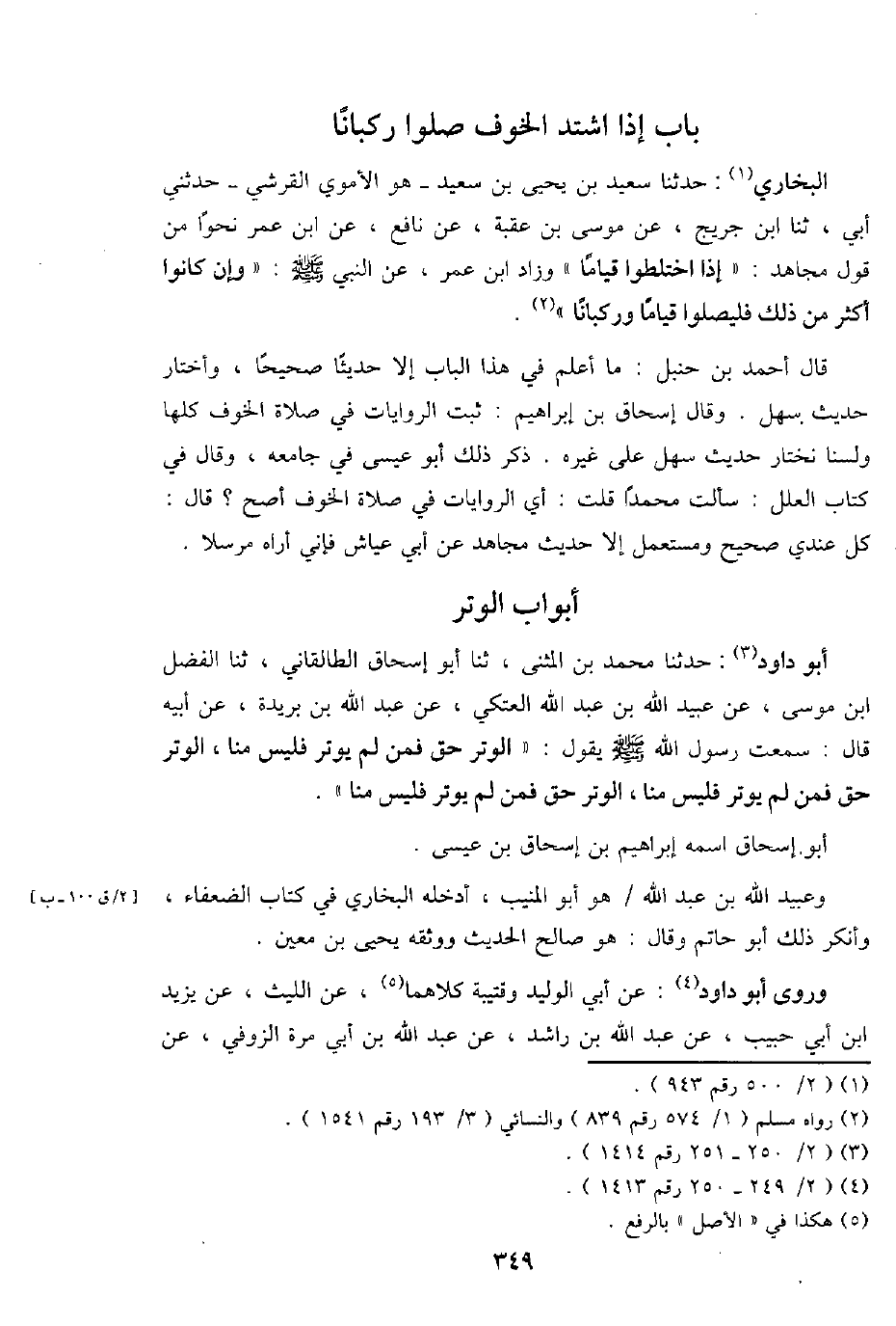 أَبُو دَاوُد: حَدثنَا مُحَمَّد بن الْمثنى، ثَنَا أَبُو إِسْحَاق الطَّالقَانِي، ثَنَا الْفضل ابْن مُوسَى، عَن عبيد الله بن عبد الله الْعَتكِي، عَن عبد الله بن بُرَيْدَة، عَن أَبِيه قَالَ: سَمِعت رَسُول الله - صَلَّى اللَّهُ عَلَيْهِ وَسَلَّم َ - يَقُول: " الْوتر حق فَمن لم يُوتر فَلَيْسَ منا، الْوتر حق فَمن لم يُوتر فَلَيْسَ منا، الْوتر حق فَمن لم يُوتر فَلَيْسَ منا ".