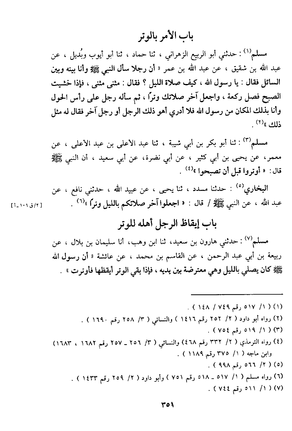 مُسلم: حَدثنِي أَبُو الرّبيع الزهْرَانِي، ثَنَا حَمَّاد، ثَنَا أَبُو أَيُّوب وَبُدَيْل، عَن عبد الله بن شَقِيق، عَن عبد الله بن عمر " أَن رجلا سَأَلَ النَّبِي - صَلَّى اللَّهُ عَلَيْهِ وَسَلَّم َ - وَأَنا بَينه وَبَين السَّائِل فَقَالَ: يَا رَسُول الله، كَيفَ صَلَاة اللَّيْل؟ فَقَالَ: مثنى مثنى، فَإِذا خشيت الصُّبْح فصل رَكْعَة، وَاجعَل آخر صَلَاتك وترا، ثمَّ سَأَلَهُ رجل على رَأس الْحول وَأَنا بذلك الْمَكَان من رَسُول الله فَلَا أَدْرِي أهوَ ذَلِك الرجل أَو رجل آخر فَقَالَ لَهُ مثل ذَلِك ".