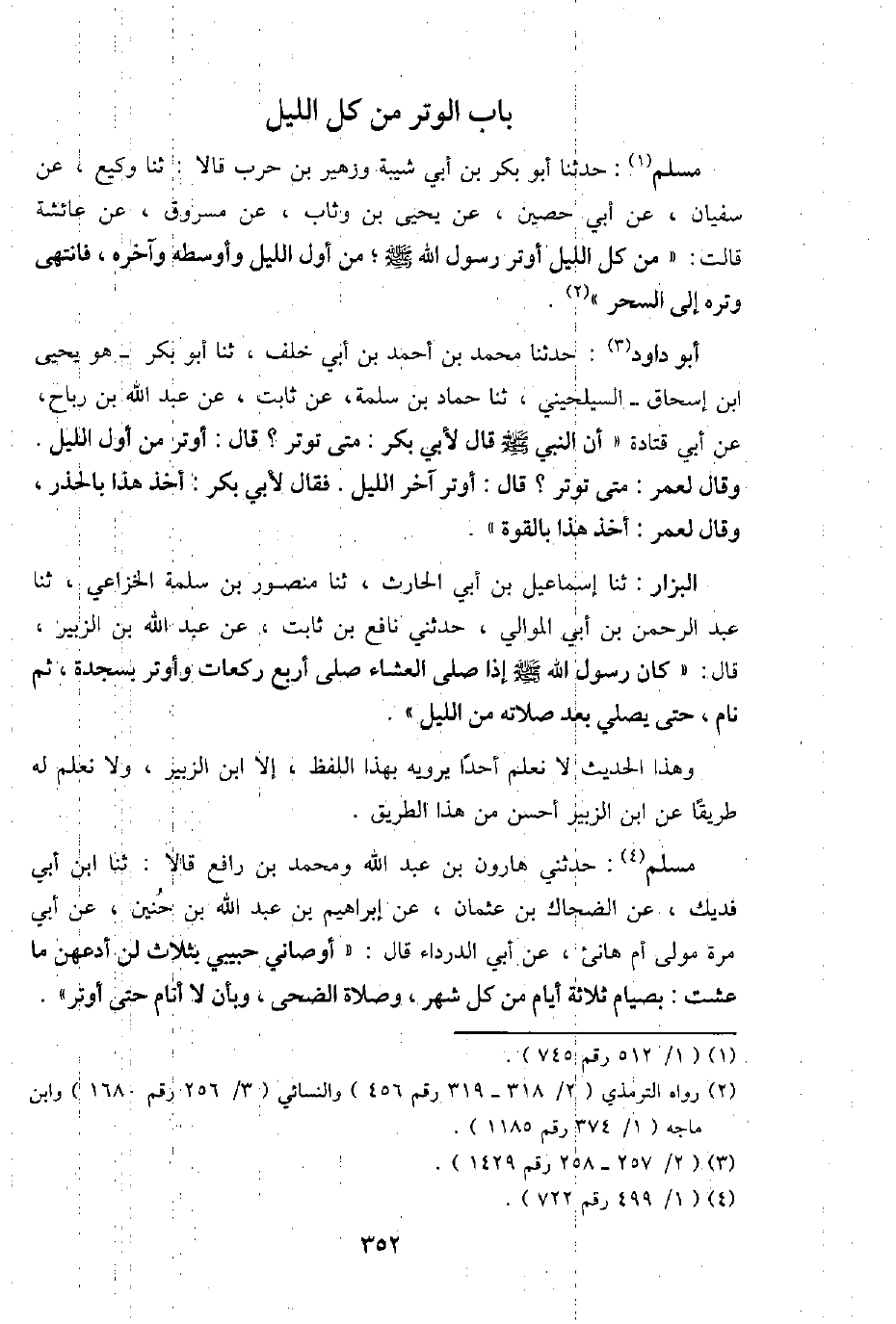 مُسلم: حَدثنَا أَبُو بكر بن أبي شيبَة وَزُهَيْر بن حَرْب قَالَا: ثَنَا وَكِيع، عَن سُفْيَان، عَن أبي حُصَيْن، عَن يحيى بن وثاب، عَن مَسْرُوق، عَن عَائِشَة قَالَت: " من كل اللَّيْل أوتر رَسُول الله - صَلَّى اللَّهُ عَلَيْهِ وَسَلَّم َ -؛ من أول اللَّيْل وأوسطه وَآخره، فَانْتهى وتره إِلَى السحر ".