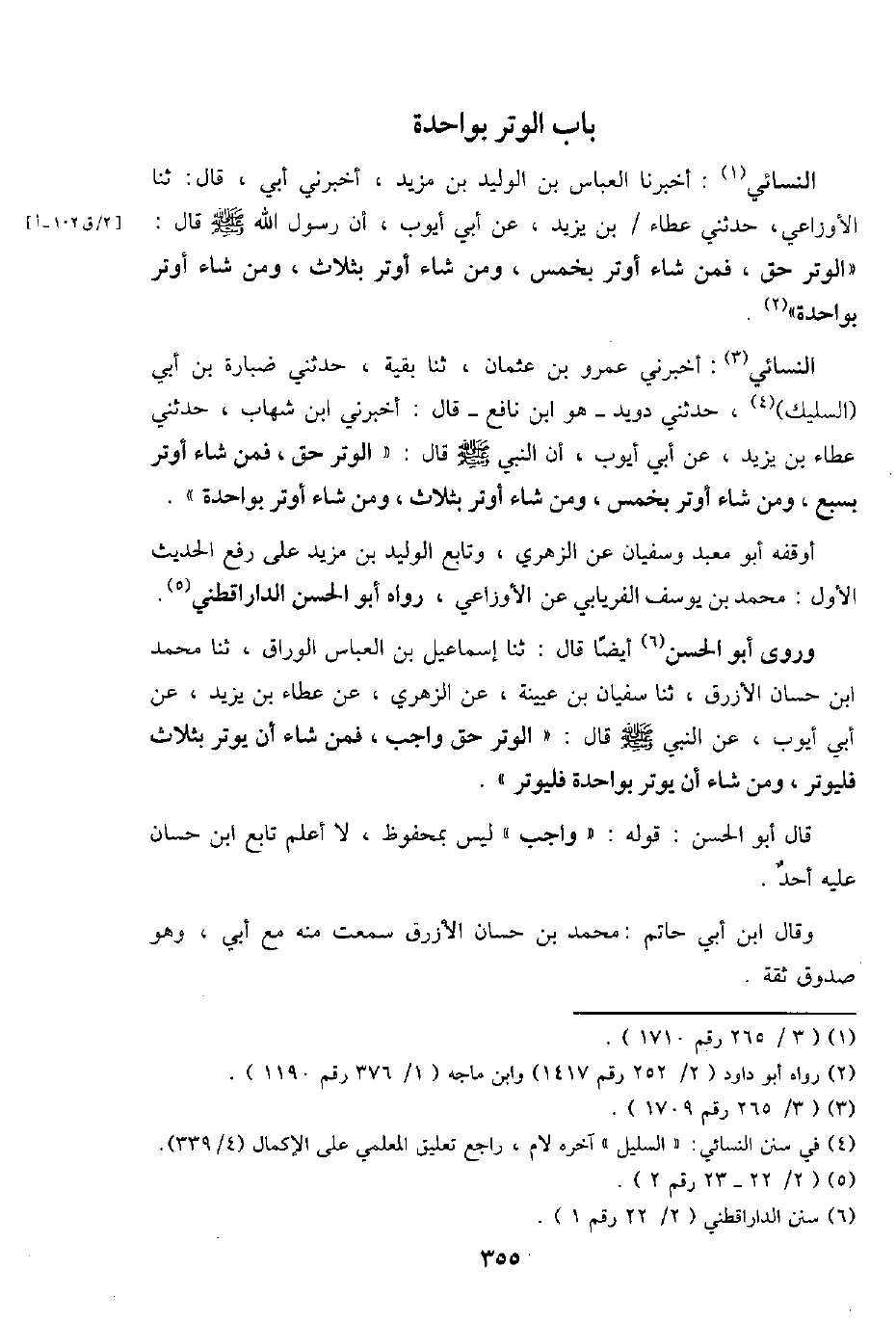 النَّسَائِيّ: أَخْبرنِي عَمْرو بن عُثْمَان، ثَنَا بَقِيَّة، حَدثنِي ضبارة بن أبي (السليك) ، حَدثنِي دويد - هُوَ ابْن نَافِع - قَالَ: أَخْبرنِي ابْن شهَاب، حَدثنِي عَطاء بن يزِيد، عَن أبي أَيُّوب، أَن النَّبِي - صَلَّى اللَّهُ عَلَيْهِ وَسَلَّم َ - قَالَ: " الْوتر حق، فَمن شَاءَ أوتر بِسبع، وَمن شَاءَ أوتر بِخمْس، وَمن شَاءَ أوتر بِثَلَاث، وَمن شَاءَ أوتر بِوَاحِدَة ".