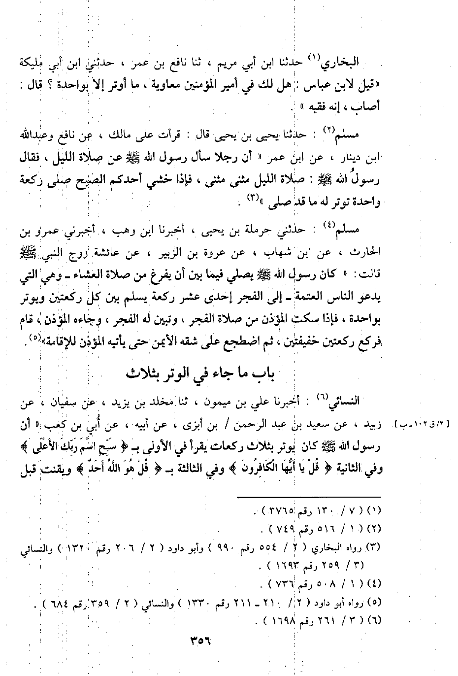 مُسلم: حَدثنَا يحيى بن يحيى قَالَ: قَرَأت على مَالك، عَن نَافِع وَعبد الله ابْن دِينَار، عَن ابْن عمر " أَن رجلا سَأَلَ رَسُول الله - صَلَّى اللَّهُ عَلَيْهِ وَسَلَّم َ - عَن صَلَاة اللَّيْل، فَقَالَ رَسُول الله - صَلَّى اللَّهُ عَلَيْهِ وَسَلَّم َ -: صَلَاة اللَّيْل مثنى مثنى، فَإِذا خشِي أحدكُم الصُّبْح صلى رَكْعَة وَاحِدَة توتر لَهُ مَا قد صلى ".