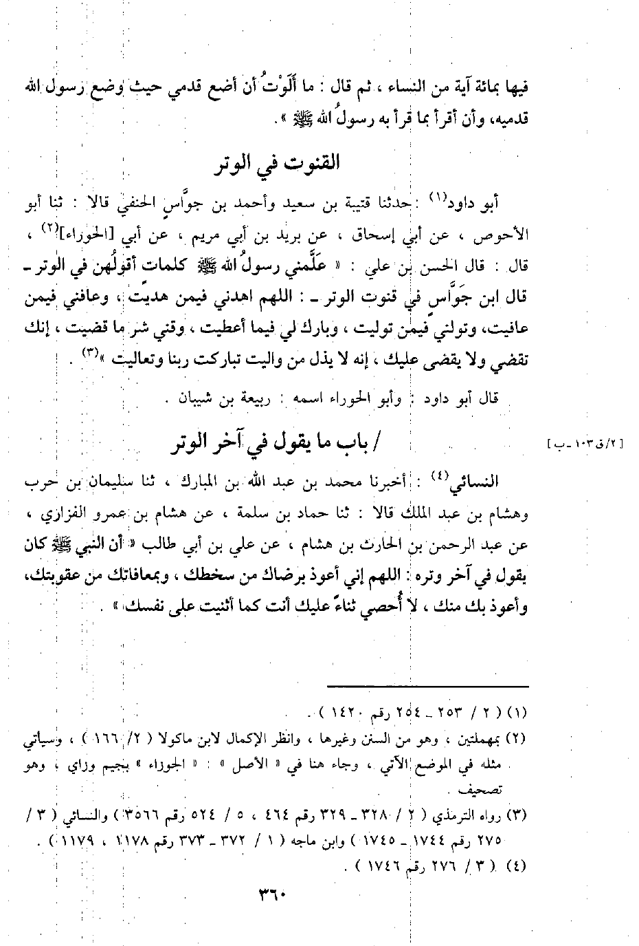 أَبُو دَاوُد: حَدثنَا قُتَيْبَة بن سعيد وَأحمد بن جواس الْحَنَفِيّ قَالَا: ثَنَا أَبُو الْأَحْوَص، عَن أبي إِسْحَاق، عَن بريد بن أبي مَرْيَم، عَن أبي [الْحَوْرَاء] ، قَالَ: قَالَ الْحسن بن عَليّ: " عَلمنِي رَسُول الله - صَلَّى اللَّهُ عَلَيْهِ وَسَلَّم َ - كَلِمَات أقولهن فِي الْوتر - قَالَ ابْن جواس فِي قنوت الْوتر -: اللَّهُمَّ اهدني فِيمَن هديت، وَعَافنِي فِيمَن عافيت، وتولني فِيمَن توليت، وَبَارك لي فِيمَا أَعْطَيْت، وقنى شَرّ مَا قضيت، إِنَّك تقضي وَلَا يقْضِي عَلَيْك، إِنَّه لَا يذل من واليت تَبَارَكت رَبنَا وَتَعَالَيْت ".