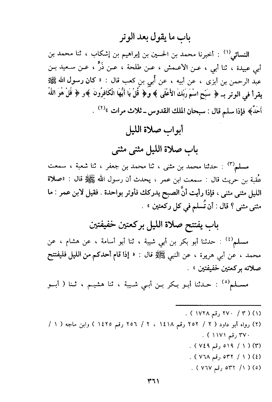 مُسلم: حَدثنَا مُحَمَّد بن مثنى، ثَنَا مُحَمَّد بن جَعْفَر، ثَنَا شُعْبَة، سَمِعت عقبَة بن حُرَيْث قَالَ: سَمِعت ابْن عمر، يحدث أَن رَسُول الله - صَلَّى اللَّهُ عَلَيْهِ وَسَلَّم َ - قَالَ: " صَلَاة اللَّيْل مثنى مثنى، فَإِذا رَأَيْت أَن الصُّبْح يدركك فأوتر بِوَاحِدَة. فَقيل لِابْنِ عمر: مَا مثنى مثنى؟ قَالَ: أَن تسلم فِي كل رَكْعَتَيْنِ ".