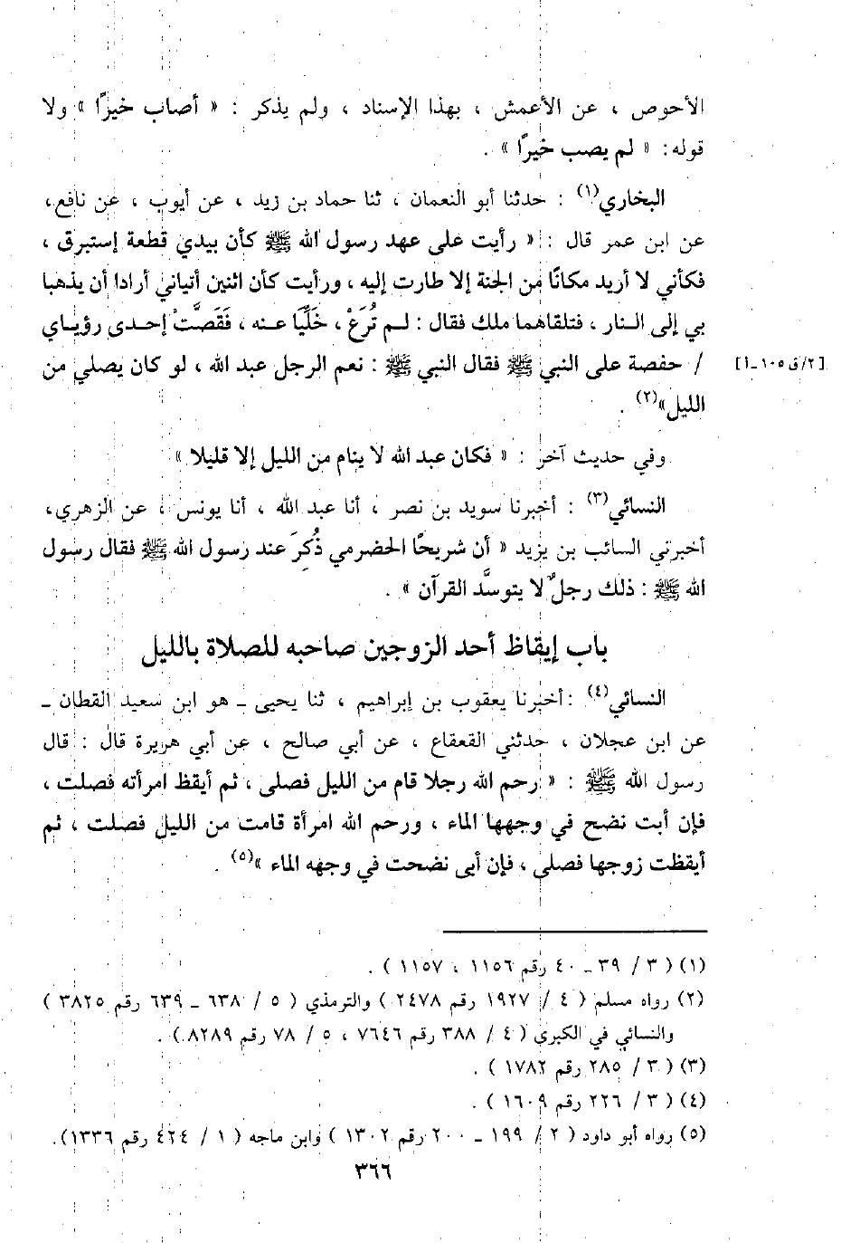 النَّسَائِيّ: أخبرنَا يَعْقُوب بن إِبْرَاهِيم، ثَنَا يحيى - هُوَ ابْن سعيد الْقطَّان - عَن ابْن عجلَان، حَدثنِي الْقَعْقَاع، عَن أبي صَالح، عَن أبي هُرَيْرَة قَالَ: قَالَ رَسُول الله - صَلَّى اللَّهُ عَلَيْهِ وَسَلَّم َ -: رحم الله رجلا قَامَ من اللَّيْل فصلى، ثمَّ أيقظ امْرَأَته فصلت، فَإِن أَبَت نضح فِي وَجههَا المَاء، ورحم الله امْرَأَة قَامَت من اللَّيْل فصلت، ثمَّ أيقظت زَوجهَا فصلى، فَإِن أبي نضحت فِي وَجهه المَاء ".