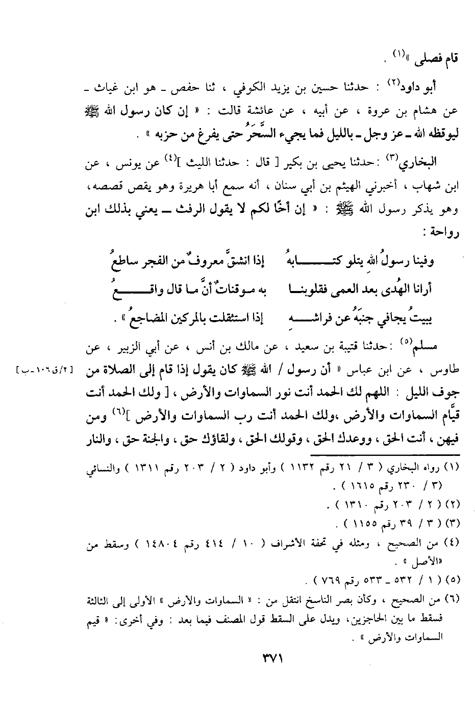 مُسلم: حَدثنَا قُتَيْبَة بن سعيد، عَن مَالك بن أنس، عَن أبي الزبير، عَن طَاوس، عَن ابْن عَبَّاس " أَن رَسُول / الله - صَلَّى اللَّهُ عَلَيْهِ وَسَلَّم َ - كَانَ يَقُول إِذا قَامَ إِلَى الصَّلَاة من جَوف اللَّيْل: اللَّهُمَّ لَك الْحَمد أَنْت نور السَّمَاوَات وَالْأَرْض، [وَلَك الْحَمد أَنْت قيام السَّمَاوَات وَالْأَرْض، وَلَك الْحَمد أَنْت رب السَّمَاوَات وَالْأَرْض] وَمن فِيهِنَّ، أَنْت الْحق، وَوَعدك الْحق، وقولك الْحق، ولقاؤك حق، وَالْجنَّة حق، وَالنَّار