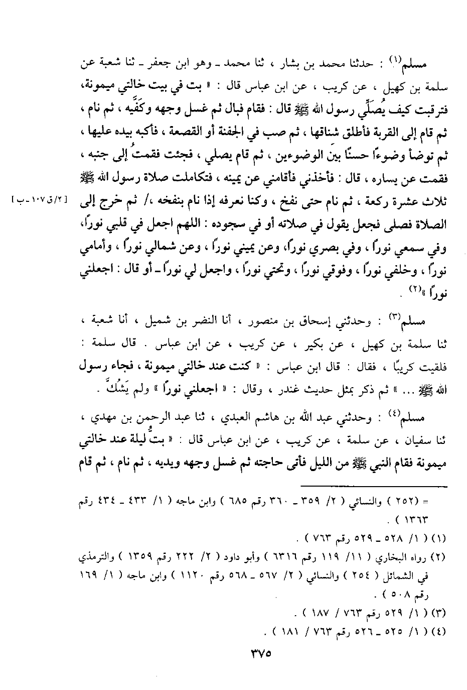 مُسلم: حَدثنَا مُحَمَّد بن بشار، ثَنَا مُحَمَّد - وَهُوَ ابْن جَعْفَر - ثَنَا شُعْبَة عَن سَلمَة بن كهيل، عَن كريب، عَن عَبَّاس قَالَ: " بت فِي بَيت خَالَتِي مَيْمُونَة، فترقبت كَيفَ يُصَلِّي رَسُول الله - صَلَّى اللَّهُ عَلَيْهِ وَسَلَّم َ - قَالَ: فَقَامَ فَبَال ثمَّ غسل وَجهه وكفيه، ثمَّ نَام، ثمَّ قَامَ إِلَى الْقرْبَة فَأطلق شناقها، ثمَّ صب فِي الْجَفْنَة أَو الْقَصعَة، فأكبه بِيَدِهِ عَلَيْهَا، ثمَّ تَوَضَّأ وضُوءًا حسنا بَين الوضوءين، ثمَّ قَامَ يُصَلِّي، فَجئْت فَقُمْت إِلَى جنبه، فَقُمْت عَن يسَاره، قَالَ: فأخذني فأقامني عَن يَمِينه، فتكاملت صَلَاة رَسُول الله - صَلَّى اللَّهُ عَلَيْهِ وَسَلَّم َ - ثَلَاث عشرَة رَكْعَة، ثمَّ نَام حَتَّى نفخ، وَكُنَّا نعرفه إِذا نَام بنفخه، / ثمَّ خرج إِلَى الصَّلَاة فصلى فَجعل يَقُول فِي صلَاته أَو فِي سُجُوده: اللَّهُمَّ اجْعَل فِي قلبِي نورا، وَفِي سَمْعِي نورا، وَفِي بَصرِي نورا، وَعَن يَمِيني نورا، وَعَن شمَالي نورا، وأمامي نورا، وخلفى نورا، وفوقي نورا، وتحتي نورا، وَاجعَل لي نورا - أَو قَالَ: اجْعَلنِي نورا ".