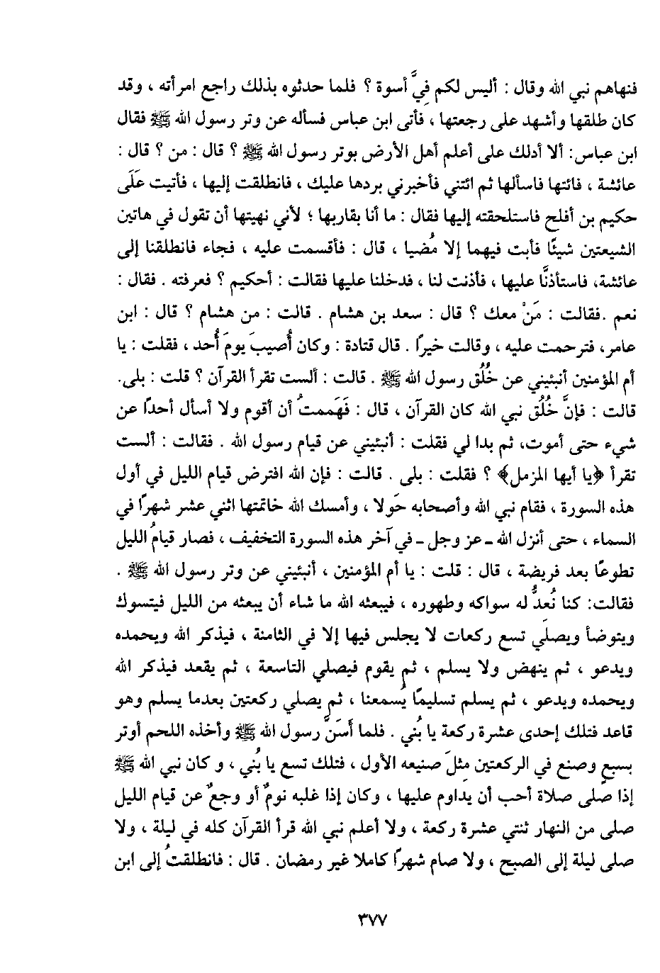 فنهاهم نَبِي الله وَقَالَ: أَلَيْسَ لكم فِي أُسْوَة؟ فَلَمَّا حدثوه بذلك رَاجع امْرَأَته، وَقد كَانَ طَلقهَا وَأشْهد على رَجعتهَا، فَأتى ابْن عَبَّاس فَسَأَلَهُ عَن وتر رَسُول الله - صَلَّى اللَّهُ عَلَيْهِ وَسَلَّم َ - فَقَالَ ابْن عَبَّاس: أَلا أدلك على أعلم أهل الأَرْض بِوتْر رَسُول الله - صَلَّى اللَّهُ عَلَيْهِ وَسَلَّم َ -؟ قَالَ: من؟ قَالَ: عَائِشَة، فائتها فاسألها ثمَّ ائْتِنِي فَأَخْبرنِي بردهَا عَلَيْك، فَانْطَلَقت إِلَيْهَا، فَأتيت على حَكِيم بن أَفْلح فاستلحقته إِلَيْهَا فَقَالَ: مَا أَنا بقاربها؛ لِأَنِّي نهيتها أَن تَقول فِي هَاتين الشيعتين شَيْئا فَأَبت فيهمَا إِلَّا مضيا، قَالَ: فأقسمت عَلَيْهِ، فجَاء فَانْطَلَقْنَا إِلَى عَائِشَة، فَاسْتَأْذَنا عَلَيْهَا، فَأَذنت لنا، فَدَخَلْنَا عَلَيْهَا فَقَالَت: أحكيم؟ فعرفته. فَقَالَ: نعم. فَقَالَت: من مَعَك؟ قَالَ: سعد بن هِشَام. قَالَت: من هِشَام؟ قَالَ: ابْن عَامر، فَتَرَحَّمت عَلَيْهِ، وَقَالَت خيرا. قَالَ قَتَادَة: وَكَانَ أُصِيب يَوْم أحد، فَقلت: يَا أم الْمُؤمنِينَ أَنْبِئِينِي عَن خلق رَسُول الله - صَلَّى اللَّهُ عَلَيْهِ وَسَلَّم َ -. قَالَت: أَلَسْت تقْرَأ الْقُرْآن؟ قلت: بلَى. قَالَت: فَإِن خلق نَبِي الله كَانَ الْقُرْآن، قَالَ: فهممت أَن أقوم وَلَا أسأَل أحدا عَن شَيْء حَتَّى أَمُوت، ثمَّ بدا لي فَقلت: أَنْبِئِينِي عَن قيام رَسُول الله. فَقَالَت: أَلَسْت تقْرَأ {يَا أَيهَا المزمل} ؟ فَقلت: بلَى. قَالَت: فَإِن الله افْترض قيام اللَّيْل فِي أول هَذِه السُّورَة، فَقَامَ نَبِي الله وَأَصْحَابه حولا، وَأمْسك الله خاتمتها اثنى عشر شهرا فِي السَّمَاء، حَتَّى أنزل الله - عز وَجل - فِي آخر هَذِه السُّورَة التَّخْفِيف، فَصَارَ قيام اللَّيْل تَطَوّعا بعد فَرِيضَة، قَالَ: قلت: يَا أم الْمُؤمنِينَ، أَنْبِئِينِي عَن وتر رَسُول الله - صَلَّى اللَّهُ عَلَيْهِ وَسَلَّم َ - فَقَالَت: كُنَّا نعد لَهُ سواكه وَطهُوره، فيبعثه الله مَا شَاءَ أَن يَبْعَثهُ من اللَّيْل فيتسوك وَيتَوَضَّأ وَيُصلي تسع رَكْعَات لَا يجلس فِيهَا إِلَّا فِي الثَّامِنَة، فيذكر الله وَيَحْمَدهُ وَيَدْعُو، ثمَّ ينْهض وَلَا يسلم، ثمَّ يقوم فَيصَلي التَّاسِعَة، ثمَّ يقْعد فيذكر الله وَيَحْمَدهُ ويدعوه، ثمَّ يسلم تَسْلِيمًا يسمعنا، ثمَّ يُصَلِّي رَكْعَتَيْنِ بَعْدَمَا يسلم وَهُوَ قَاعد فَتلك إِحْدَى عشرَة رَكْعَة يَا بني. فَلَمَّا أسن رَسُول الله - صَلَّى اللَّهُ عَلَيْهِ وَسَلَّم َ - وَأَخذه اللَّحْم أوتر بِسبع وصنع فِي الرَّكْعَتَيْنِ مثل صَنِيعه الأول، فَتلك تسع يَا بني، وَكَانَ نَبِي الله - صَلَّى اللَّهُ عَلَيْهِ وَسَلَّم َ - إِذا صلى صَلَاة أحب أَن يداوم عَلَيْهَا، وَكَانَ إِذا غَلَبَة نوم أَو وجع عَن قيام اللَّيْل صلى من النَّهَار ثِنْتَيْ عشرَة رَكْعَة، وَلَا أعلم نَبِي الله قَرَأَ الْقُرْآن كُله فِي لَيْلَة، وَلَا صلى لَيْلَة إِلَى الصُّبْح، وَلَا صَامَ شهرا كَامِلا غير رَمَضَان. قَالَ: فَانْطَلَقت إِلَى ابْن