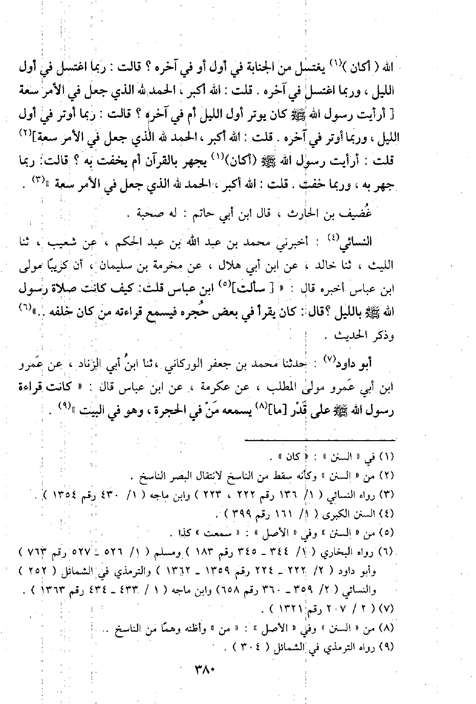 النَّسَائِيّ: أَخْبرنِي مُحَمَّد بن عبد الله بن عبد الحكم، عَن شُعَيْب، ثَنَا اللَّيْث، ثَنَا خَالِد، عَن ابْن أبي هِلَال، عَن مخرمَة بن سُلَيْمَان، أَن كريبا مولى ابْن عَبَّاس أخبرهُ قَالَ: " [سَأَلت] ابْن عَبَّاس قلت: كَيفَ كَانَت صَلَاة رَسُول الله - صَلَّى اللَّهُ عَلَيْهِ وَسَلَّم َ - بِاللَّيْلِ؟ قَالَ: كَانَ يقْرَأ فِي بعض حجره فَيسمع قِرَاءَته من كَانَ خَلفه ... ... ". وَذكر الحَدِيث.