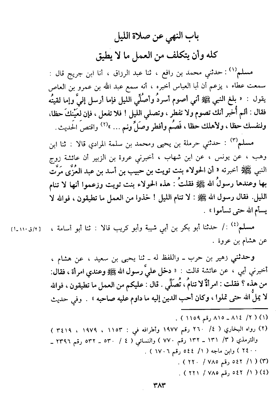 مُسلم: حَدثنِي حَرْمَلَة بن يحيى وَمُحَمّد بن سَلمَة الْمرَادِي قَالَا: ثَنَا ابْن وهب، عَن يُونُس، عَن ابْن شهَاب، أَخْبرنِي عُرْوَة بن الزبير أَن عَائِشَة زوج النَّبِي - صَلَّى اللَّهُ عَلَيْهِ وَسَلَّم َ - أخْبرته: " أَن الحولاء بنت تويت بن حبيب بن أَسد بن عبد الْعُزَّى مرت بهَا وَعِنْدهَا رَسُول الله - صَلَّى اللَّهُ عَلَيْهِ وَسَلَّم َ - فَقلت: هَذِه الحولاء بنت تويت وَزَعَمُوا أَنَّهَا لَا تنام اللَّيْل. فَقَالَ رَسُول الله - صَلَّى اللَّهُ عَلَيْهِ وَسَلَّم َ -: لَا تنام اللَّيْل! خُذُوا من الْعَمَل مَا تطيقون، فوَاللَّه لَا يسأم الله حَتَّى تسأموا ".