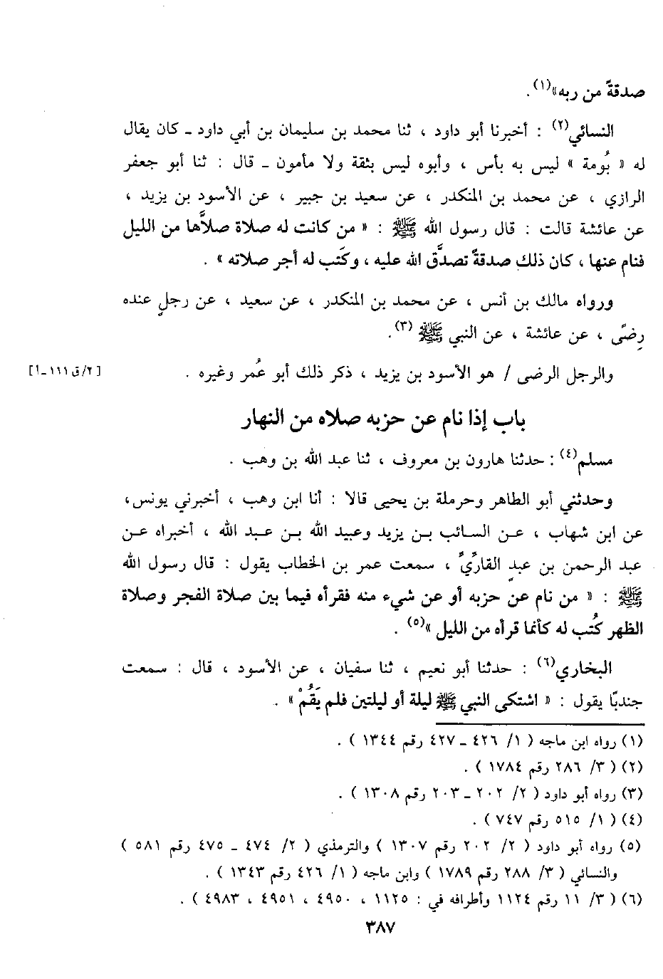النَّسَائِيّ: أخبرنَا أَبُو دَاوُد، ثَنَا مُحَمَّد بن سُلَيْمَان بن أبي دَاوُد - كَانَ يُقَال لَهُ " بومة " لَيْسَ بِهِ بَأْس، وَأَبوهُ لَيْسَ بِثِقَة وَلَا مَأْمُون - قَالَ: ثَنَا أَبُو جَعْفَر الرَّازِيّ، عَن مُحَمَّد بن الْمُنْكَدر، عَن سعيد بن جُبَير، عَن الْأسود بن يزِيد، عَن عَائِشَة قَالَت: قَالَ رَسُول الله - صَلَّى اللَّهُ عَلَيْهِ وَسَلَّم َ -: " من كَانَت لَهُ صَلَاة صلاهَا من اللَّيْل فَنَامَ عَنْهَا، كَانَ ذَلِك صَدَقَة تصدق الله عَلَيْهِ، وَكتب لَهُ أجر صلَاته ".