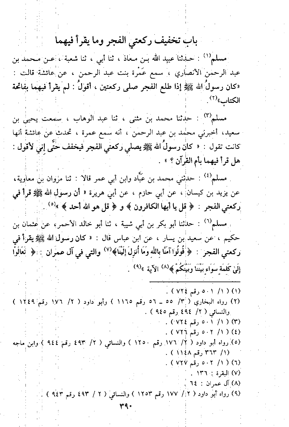 مُسلم: حَدثنَا عبيد الله بن معَاذ، ثَنَا أبي، ثَنَا شُعْبَة، عَن مُحَمَّد بن عبد الرَّحْمَن الْأنْصَارِيّ، سمع عمْرَة بنت عبد الرَّحْمَن، عَن عَائِشَة قَالَت: " كَانَ رَسُول الله - صَلَّى اللَّهُ عَلَيْهِ وَسَلَّم َ - إِذا طلع الْفجْر صلى رَكْعَتَيْنِ، أَقُول: لم يقْرَأ فيهمَا بِفَاتِحَة الْكتاب ".