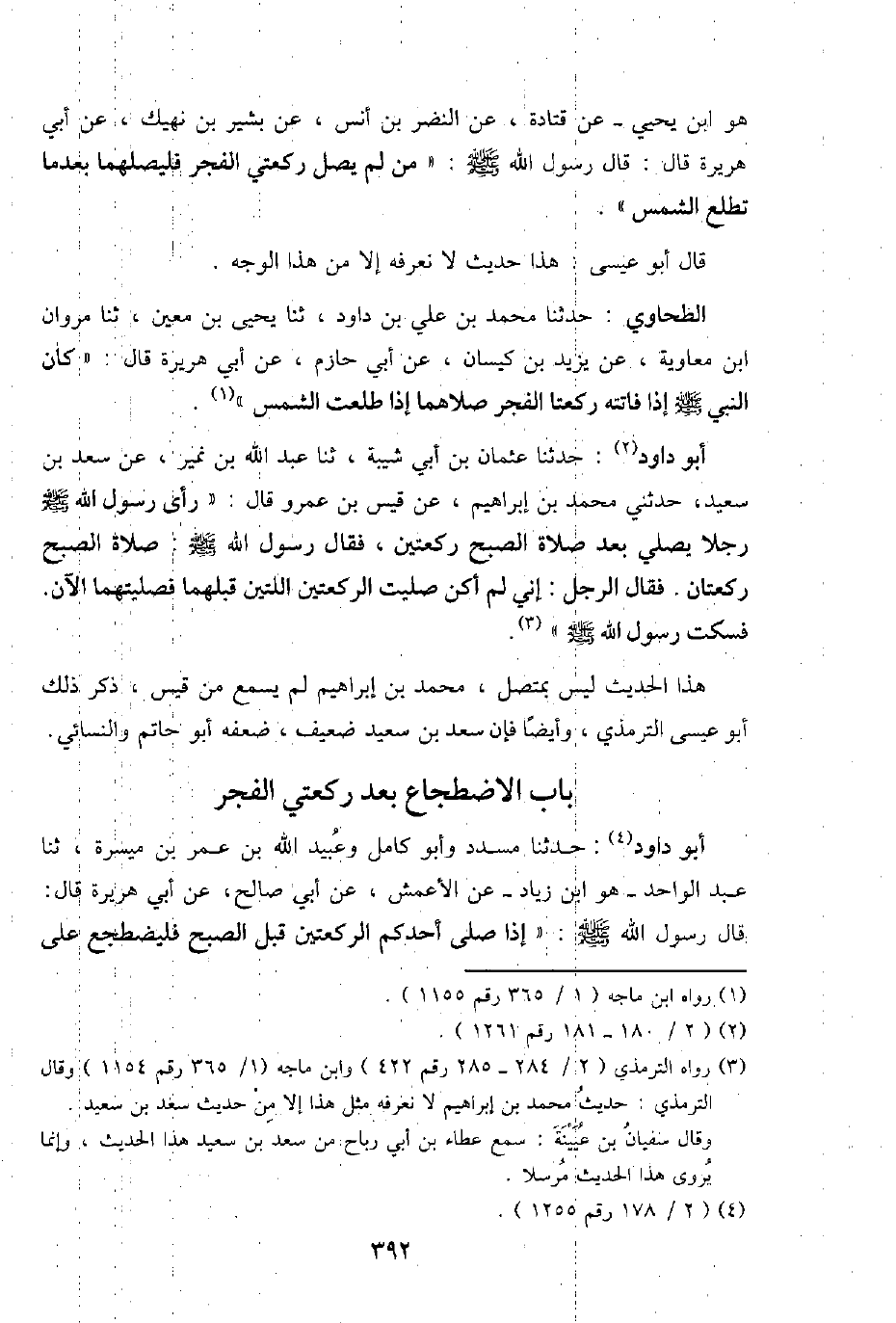 أَبُو دَاوُد: حَدثنَا مُسَدّد وَأَبُو كَامِل وَعبيد الله بن عمر بن ميسرَة، ثَنَا عبد الْوَاحِد - هُوَ ابْن زِيَاد - عَن الْأَعْمَش، عَن أبي صَالح، عَن أبي هُرَيْرَة قَالَ: قَالَ رَسُول الله - صَلَّى اللَّهُ عَلَيْهِ وَسَلَّم َ -: " إِذا صلى أحدكُم الرَّكْعَتَيْنِ قبل الصُّبْح فليضطجع على