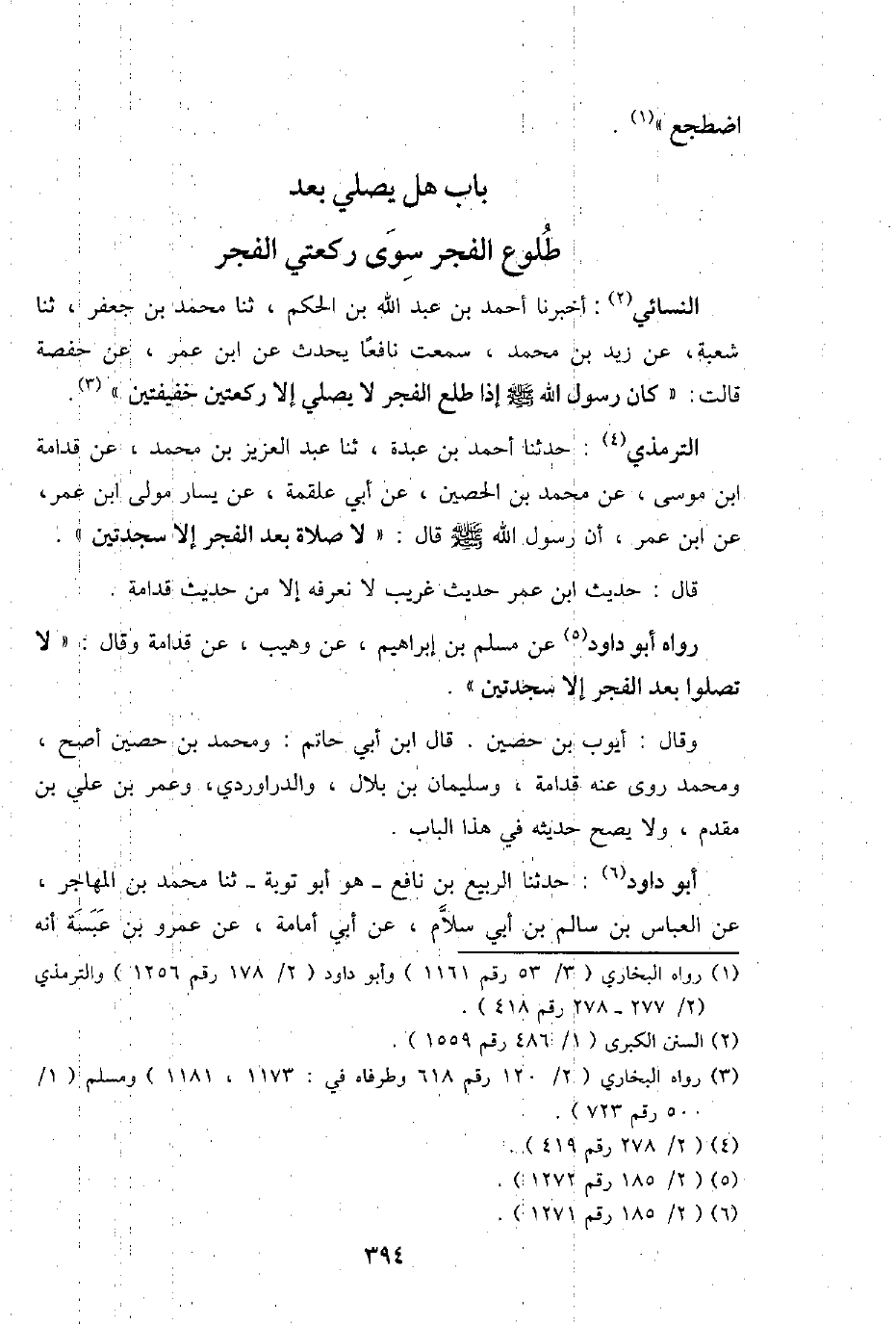 التِّرْمِذِيّ: حَدثنَا أَحْمد بن عَبدة، ثَنَا عبد الْعَزِيز بن مُحَمَّد، عَن قدامَة ابْن مُوسَى، عَن مُحَمَّد بن الْحصين، عَن أبي عَلْقَمَة، عَن يسَار مولى ابْن عمر، عَن ابْن عمر، أَن رَسُول الله - صَلَّى اللَّهُ عَلَيْهِ وَسَلَّم َ - قَالَ: " لَا صَلَاة بعد الْفجْر إِلَّا سَجْدَتَيْنِ ".