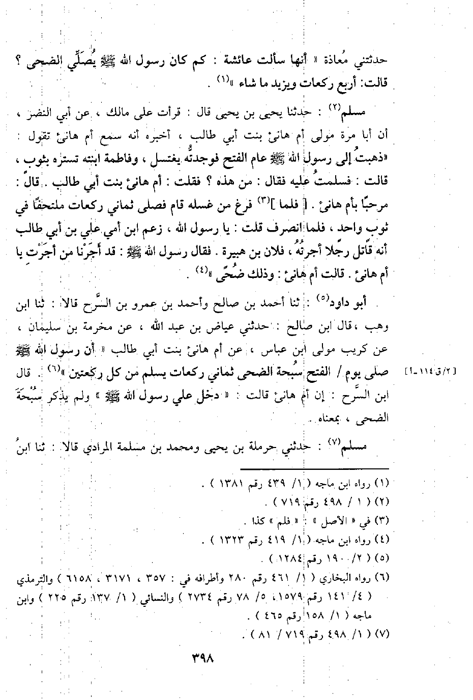 مُسلم: حَدثنَا يحيى بن يحيى قَالَ: قَرَأت على مَالك، عَن أبي النَّضر، أَن أَبَا مرّة مولى أم هَانِئ بنت أبي طَالب، أخبرهُ أَنه سمع أم هَانِئ تَقول: " ذهبت إِلَى رَسُول الله - صَلَّى اللَّهُ عَلَيْهِ وَسَلَّم َ - عَام الْفَتْح فَوَجَدته يغْتَسل، وَفَاطِمَة ابْنَته تستره بِثَوْب، قَالَت: فَسلمت عَلَيْهِ فَقَالَ: من هَذِه؟ فَقلت: أم هَانِئ بنت أبي طَالب. قَالَ: مرْحَبًا بِأم هَانِئ. [فَلَمَّا] فرغ من غسله قَامَ فصلى ثَمَانِي رَكْعَات ملتحفا فِي ثوب وَاحِد، فَلَمَّا انْصَرف قلت: يَا رَسُول الله، زعم ابْن أُمِّي عَليّ بن أبي طَالب أَنه قَاتل رجلا أجرته، فلَان بن هُبَيْرَة. فَقَالَ رَسُول الله - صَلَّى اللَّهُ عَلَيْهِ وَسَلَّم َ -: قد أجرنا من أجرت يَا أم هَانِئ. قَالَت أم هَانِئ: وَذَلِكَ ضحى ".