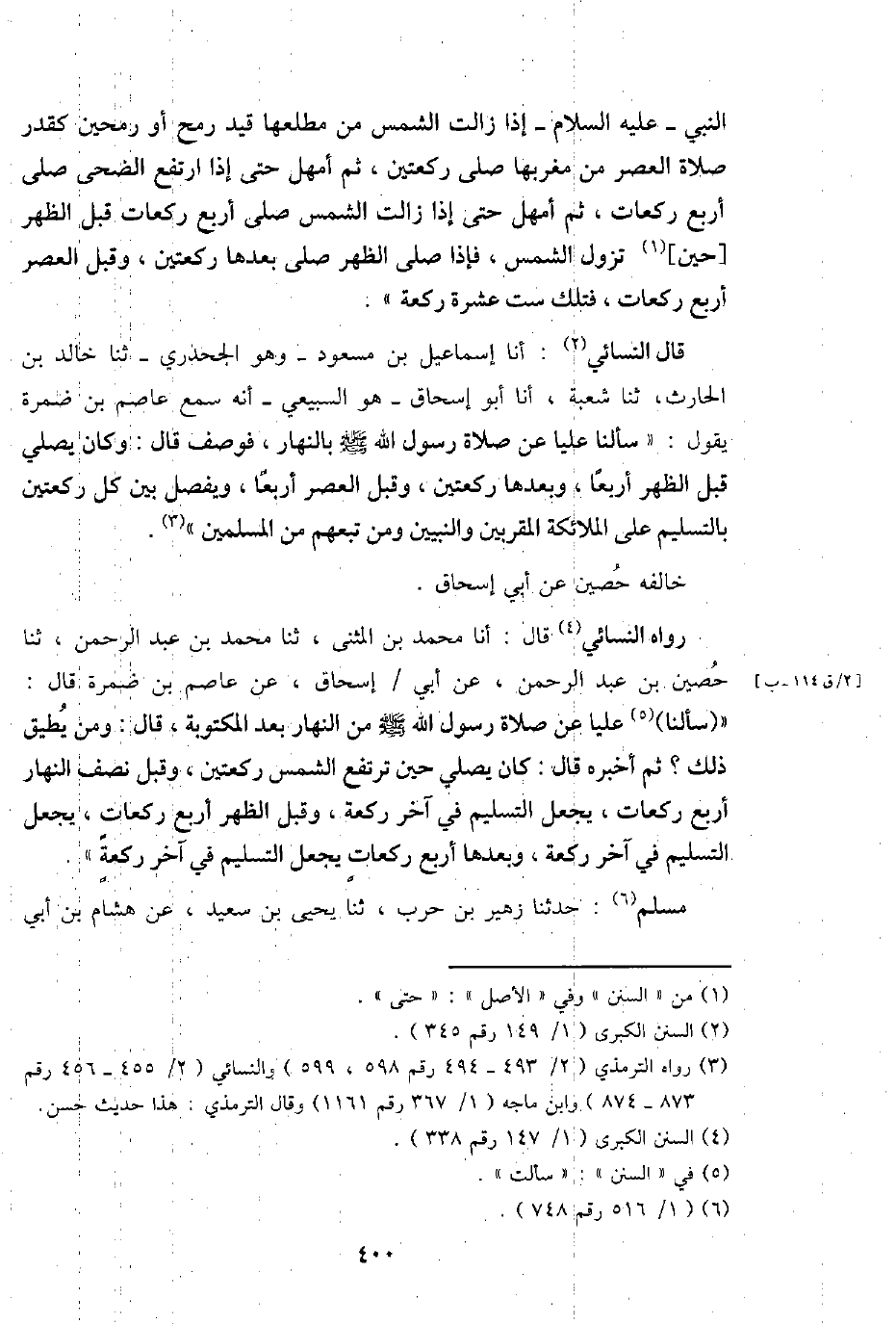 رَوَاهُ النَّسَائِيّ قَالَ: أَنا مُحَمَّد بن الْمثنى، ثَنَا مُحَمَّد بن عبد الرَّحْمَن، ثَنَا حُصَيْن بن عبد الرَّحْمَن، عَن أبي / إِسْحَاق، عَن عَاصِم بن ضَمرَة قَالَ: " (سَأَلنَا) عليا عَن صَلَاة رَسُول الله - صَلَّى اللَّهُ عَلَيْهِ وَسَلَّم َ - من النَّهَار بعد الْمَكْتُوبَة، قَالَ: وَمن يُطيق ذَلِك؟ ثمَّ أخبرهُ قَالَ: كَانَ يُصَلِّي حِين ترْتَفع الشَّمْس رَكْعَتَيْنِ، وَقبل نصف النَّهَار أَربع رَكْعَات، يَجْعَل التَّسْلِيم فِي آخر رَكْعَة، وَقبل الظّهْر أَربع رَكْعَات، يَجْعَل التَّسْلِيم فِي آخر رَكْعَة، وَبعدهَا أَربع رَكْعَات يَجْعَل التَّسْلِيم فِي آخر رَكْعَة ".