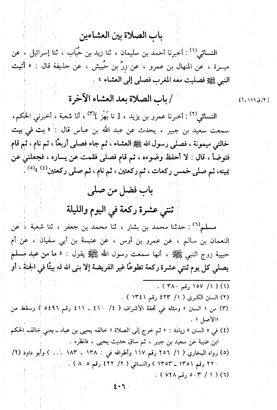 النَّسَائِيّ: أخبرنَا أَحْمد بن سُلَيْمَان، ثَنَا زيد بن حباب، ثَنَا إِسْرَائِيل، عَن ميسرَة، عَن الْمنْهَال بن عَمْرو، عَن زر بن حُبَيْش، عَن حُذَيْفَة قَالَ: " " أتيت النَّبِي - صَلَّى اللَّهُ عَلَيْهِ وَسَلَّم َ - فَصليت مَعَه الْمغرب فصلى إِلَى الْعشَاء ".