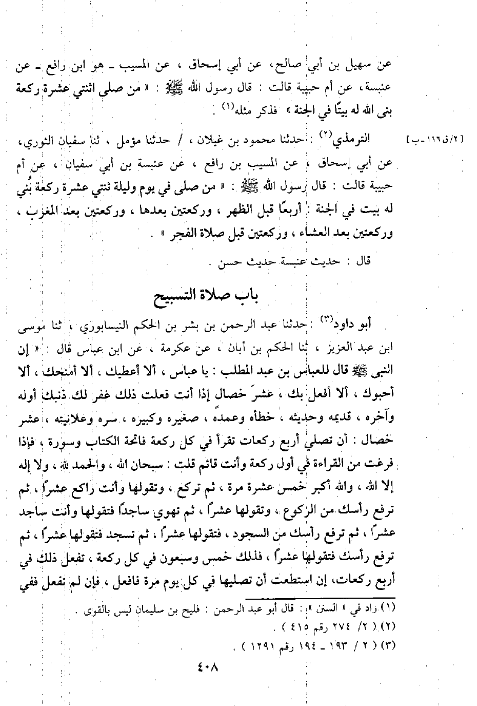 أَبُو دَاوُد: حَدثنَا عبد الرَّحْمَن بن بشر بن الحكم النَّيْسَابُورِي، ثَنَا مُوسَى ابْن عبد الْعَزِيز، ثَنَا الحكم بن أبان، عَن عِكْرِمَة، عَن ابْن عَبَّاس قَالَ: " إِن النَّبِي - صَلَّى اللَّهُ عَلَيْهِ وَسَلَّم َ - قَالَ للْعَبَّاس بن عبد الْمطلب: يَا عَبَّاس، أَلا أُعْطِيك، أَلا أمنحك، أَلا أحبوك، أَلا أفعل بك، عشر خِصَال إِذا أَنْت فعلت ذَلِك غفر لَك ذَنْبك أَوله وَآخره، قديمه وَحَدِيثه، خطأه وعمده، صغيره وكبيره، سره وعلانيته، عشر خِصَال: أَن تصلي أَربع رَكْعَات تقْرَأ فِي كل رَكْعَة فَاتِحَة الْكتاب وَسورَة، فَإِذا فرغت من الْقِرَاءَة فِي أول رَكْعَة وَأَنت قَائِم قلت: سُبْحَانَ الله، وَالْحَمْد لله، وَلَا إِلَه إِلَّا الله، وَالله أكبر خمس عشرَة مرّة، ثمَّ تركع، وتقولها وَأَنت رَاكِع عشرا، ثمَّ ترفع رَأسك من الرُّكُوع، وتقولها عشرا، ثمَّ تهوي سَاجِدا فتقولها وَأَنت ساجد عشرا، ثمَّ ترفع رَأسك من السُّجُود، فتقولها عشرا، ثمَّ تسْجد فتقولها عشرا، ثمَّ ترفع رَأسك فتقولها عشرا، فَذَلِك خمس وَسَبْعُونَ فِي كل رَكْعَة، تفعل ذَلِك فِي أَربع رَكْعَات، إِن اسْتَطَعْت أَن تصليها فِي كل يَوْم مرّة فأفعل، فَإِن لم تفعل فَفِي