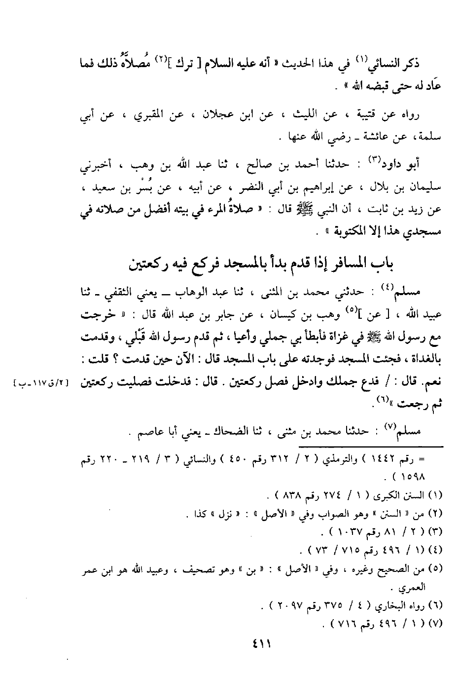 مُسلم: حَدثنِي مُحَمَّد بن الْمثنى، ثناعبد الْوَهَّاب - يَعْنِي الثَّقَفِيّ - ثَنَا عبيد الله، [عَن] وهب بن كيسَان، عَن جَابر بن عبد الله قَالَ: " خرجت مَعَ رَسُول الله - صَلَّى اللَّهُ عَلَيْهِ وَسَلَّم َ - فِي غزَاة فَأَبْطَأَ بِي جملي وأعيا، ثمَّ قدم رَسُول الله قبلي، وقدمت بِالْغَدَاةِ، فَجئْت الْمَسْجِد فَوَجَدته على بَاب الْمَسْجِد قَالَ: الْآن حِين قدمت؟ قلت: نعم. قَالَ: / فدع جملك وادخل فصل رَكْعَتَيْنِ. قَالَ: فَدخلت فَصليت رَكْعَتَيْنِ ثمَّ رجعت ".