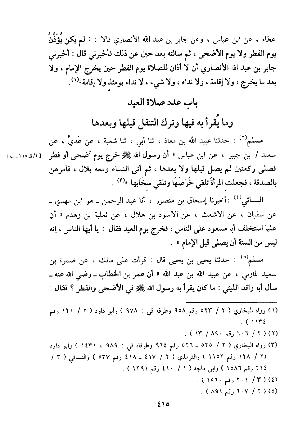 عَطاء، عَن ابْن عَبَّاس، وَعَن جَابر بن عبد الله الْأنْصَارِيّ قَالَا: " لم يكن يُؤذن يَوْم الْفطر وَلَا يَوْم الْأَضْحَى، ثمَّ سَأَلته بعد حِين عَن ذَلِك فَأَخْبرنِي قَالَ: أَخْبرنِي جَابر بن عبد الله الْأنْصَارِيّ أَن لَا أَذَان للصَّلَاة يَوْم الْفطر حِين يخرج الإِمَام، وَلَا بَعْدَمَا مَا يخرج، وَلَا إِقَامَة، وَلَا نِدَاء، وَلَا شَيْء، لَا نِدَاء يَوْمئِذٍ وَلَا إِقَامَة ".