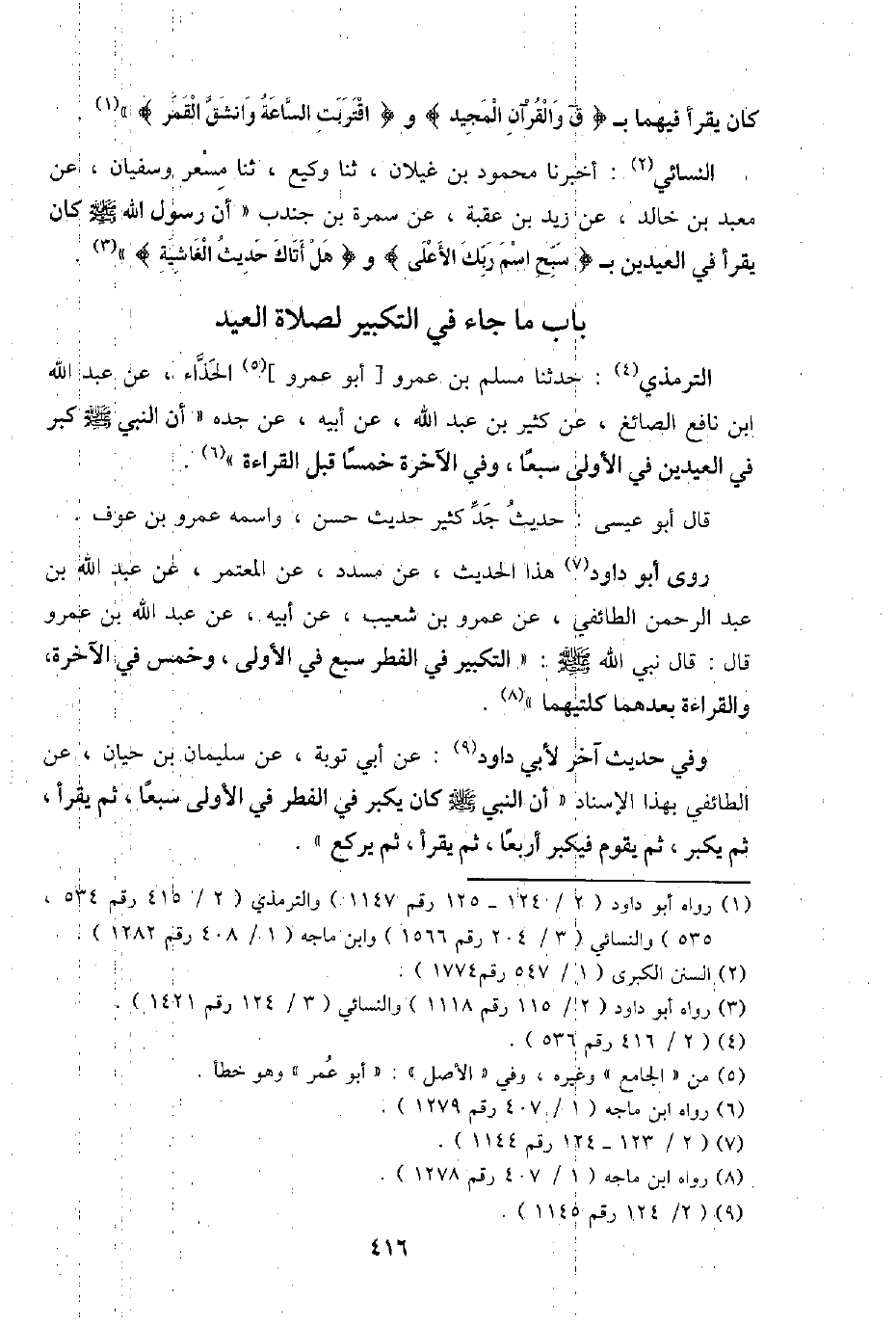 روى أَبُو دَاوُد هَذَا الحَدِيث، عَن مُسَدّد، عَن الْمُعْتَمِر، عَن عبد الله بن عبد الرَّحْمَن الطَّائِفِي، عَن عَمْرو بن شُعَيْب، عَن أَبِيه، عَن عبد الله بن عَمْرو قَالَ: قَالَ نَبِي الله - صَلَّى اللَّهُ عَلَيْهِ وَسَلَّم َ -: " التَّكْبِير فِي الْفطر سبع فِي الأولى، وَخمْس فِي الْآخِرَة، وَالْقِرَاءَة بعدهمَا كلتيهما ".