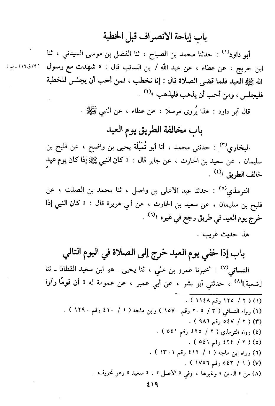 أَبُو دَاوُد: حَدثنَا مُحَمَّد بن الصَّباح، ثَنَا الْفضل بن مُوسَى السينَانِي، ثَنَا ابْن جريج، عَن عَطاء، عَن عبد الله / بن السَّائِب قَالَ: " شهِدت مَعَ رَسُول الله - صَلَّى اللَّهُ عَلَيْهِ وَسَلَّم َ - الْعِيد فَلَمَّا قضي الصَّلَاة قَالَ: إِنَّا نخطب، فَمن أحب أَن يجلس للخطبة فليجلس، وَمن أحب أَن يذهب فليذهب ".