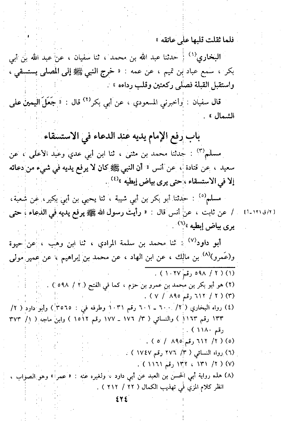 البُخَارِيّ: حَدثنَا عبد الله بن مُحَمَّد، ثَنَا سُفْيَان، عَن عبد الله بن أبي بكر، سمع عباد بن تَمِيم، عَن عَمه: " خرج النَّبِي - صَلَّى اللَّهُ عَلَيْهِ وَسَلَّم َ - إِلَى الْمصلى يَسْتَسْقِي، واستقبل الْقبْلَة فصلى رَكْعَتَيْنِ وقلب رِدَاءَهُ ".