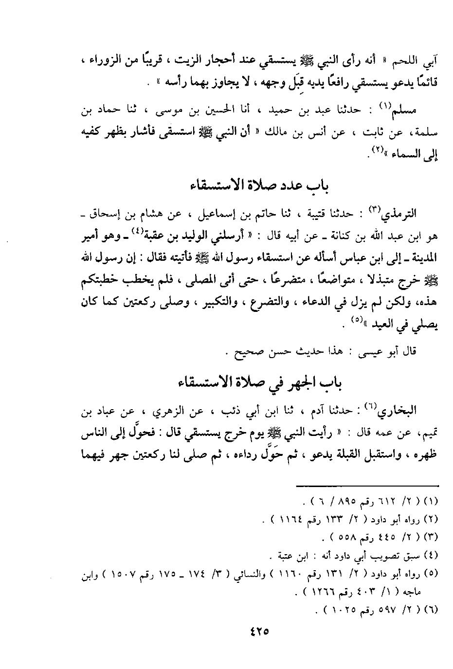 التِّرْمِذِيّ: حَدثنَا قُتَيْبَة، ثَنَا حَاتِم بن إِسْمَاعِيل، عَن هِشَام بن إِسْحَاق - هُوَ ابْن عبد الله بن كنَانَة - عَن أَبِيه قَالَ: " أَرْسلنِي الْوَلِيد بن عقبَة - وَهُوَ أَمِير الْمَدِينَة - إِلَى ابْن عَبَّاس أسأله عَن استسقاء رَسُول الله - صَلَّى اللَّهُ عَلَيْهِ وَسَلَّم َ - فَأَتَيْته فَقَالَ: إِن رَسُول الله - صَلَّى اللَّهُ عَلَيْهِ وَسَلَّم َ - خرج متبذلا، متواضعا، متضرعا، حَتَّى أَتَى الْمصلى، فَلم يخْطب خطبتكم هَذِه وَلَكِن لم يزل فِي الدُّعَاء، والتضرع، وَالتَّكْبِير، وَصلى رَكْعَتَيْنِ كَمَا كَانَ يُصَلِّي فِي الْعِيد ".