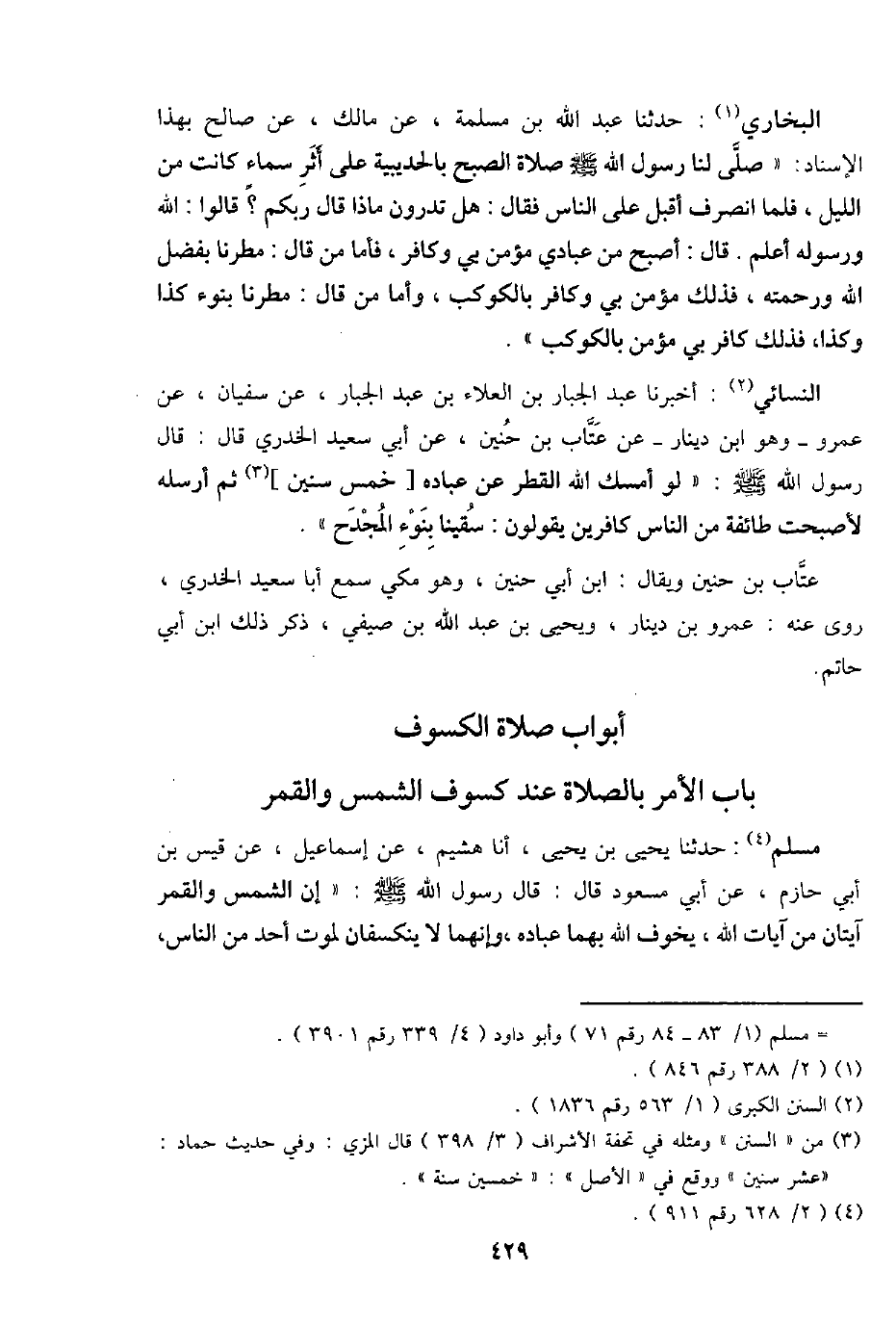 البُخَارِيّ: حَدثنَا عبد الله بن مسلمة، عَن مَالك، عَن صَالح بِهَذَا الْإِسْنَاد: " صلى لنا رَسُول الله - صَلَّى اللَّهُ عَلَيْهِ وَسَلَّم َ - صَلَاة الصُّبْح بِالْحُدَيْبِية على أثر سَمَاء كَانَت من اللَّيْل، فَلَمَّا انْصَرف أقبل على النَّاس فَقَالَ: هَل تَدْرُونَ مَاذَا قَالَ ربكُم؟ قَالُوا: الله وَرَسُوله أعلم. قَالَ: أصبح من عبَادي مُؤمن بِي وَكَافِر، فَأَما من قَالَ: مُطِرْنَا بِفضل الله وَرَحمته، فَذَلِك مُؤمن بِي وَكَافِر بالكوكب، وَأما من قَالَ: مُطِرْنَا بِنَوْء كَذَا وَكَذَا فَذَلِك كَافِر بِي مُؤمن بالكوكب ".