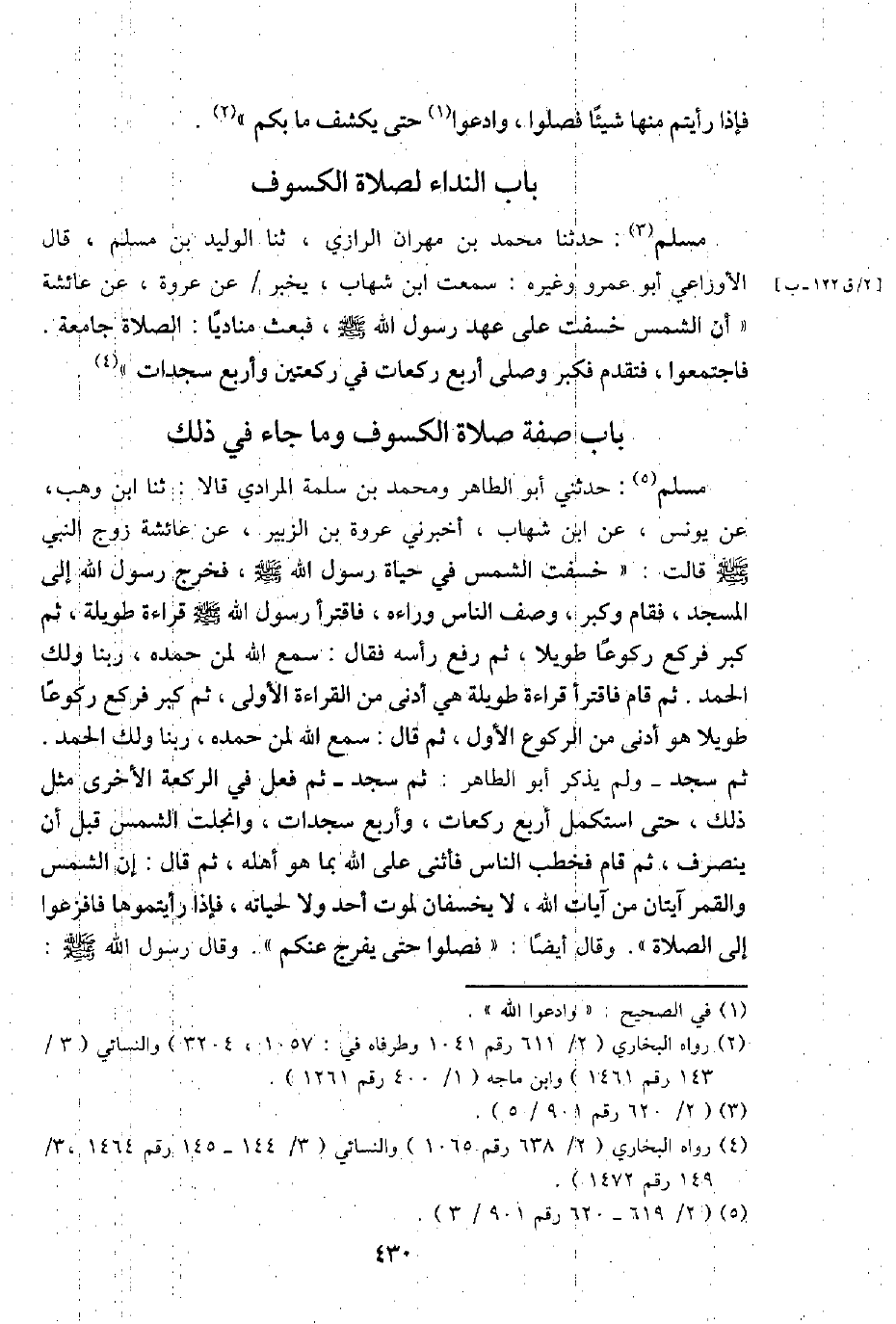 مُسلم: حَدثنِي أَبُو طَاهِر وَمُحَمّد بن سَلمَة الْمرَادِي قَالَا: ثَنَا ابْن وهب، عَن يُونُس، عَن ابْن شهَاب، أَخْبرنِي عُرْوَة بن الزبير، عَن عَائِشَة زوج النَّبِي - صَلَّى اللَّهُ عَلَيْهِ وَسَلَّم َ - قَالَت: " خسفت الشَّمْس فِي حَيَاة رَسُول الله - صَلَّى اللَّهُ عَلَيْهِ وَسَلَّم َ -، فَخرج رَسُول الله إِلَى الْمَسْجِد، فَقَامَ وَكبر، وصف النَّاس وَرَاءه، فاقترأ رَسُول الله - صَلَّى اللَّهُ عَلَيْهِ وَسَلَّم َ - قِرَاءَة طَوِيلَة، ثمَّ كبر فَرَكَعَ رُكُوعًا طَويلا، ثمَّ رفع رَأسه فَقَالَ: سمع الله لمن حَمده، رَبنَا وَلَك الْحَمد. ثمَّ قَامَ فاقترأ قِرَاءَة طَوِيلَة هِيَ أدنى من الْقِرَاءَة الأولى، ثمَّ كبر فَرَكَعَ رُكُوعًا طَويلا هُوَ أدنى من الرُّكُوع الأول، ثمَّ قَالَ: سمع الله لمن حَمده، رَبنَا وَلَك الْحَمد. ثمَّ سجد - وَلم يذكر أَبُو الطَّاهِر: ثمَّ سجد - ثمَّ فعل فِي الرَّكْعَة الْأُخْرَى مثل ذَلِك، حَتَّى اسْتكْمل أَربع رَكْعَات وَأَرْبع سَجدَات، وانجلت الشَّمْس قبل أَن ينْصَرف، ثمَّ قَامَ فَخَطب النَّاس فَأثْنى على الله بِمَا هُوَ أَهله، ثمَّ قَالَ: إِن الشَّمْس وَالْقَمَر آيتان من آيَات الله، لَا يخسفان لمَوْت أحد وَلَا لِحَيَاتِهِ، فَإِذا رأيتموها فأفزعوا إِلَى الصَّلَاة ". وَقَالَ أَيْضا: " فصلوا حَتَّى يفرج عَنْكُم ". وَقَالَ رَسُول الله - صَلَّى اللَّهُ عَلَيْهِ وَسَلَّم َ -: