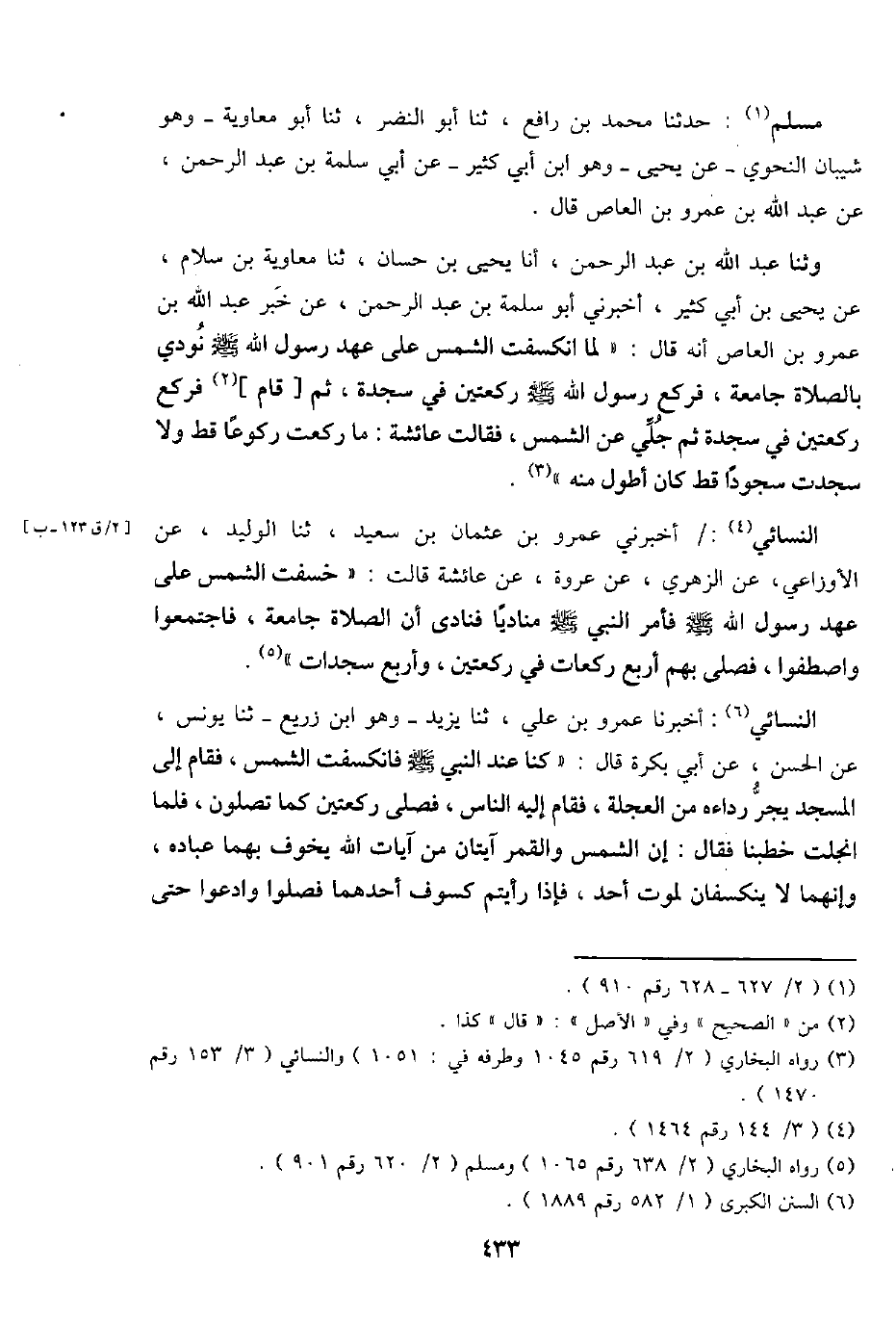 النَّسَائِيّ: / أَخْبرنِي عَمْرو بن عُثْمَان بن سعيد، ثَنَا الْوَلِيد، عَن الْأَوْزَاعِيّ، عَن الزُّهْرِيّ، عَن عُرْوَة، عَن عَائِشَة قَالَت: " خسفت الشَّمْس على عهد رَسُول الله - صَلَّى اللَّهُ عَلَيْهِ وَسَلَّم َ - فَأمر النَّبِي - صَلَّى اللَّهُ عَلَيْهِ وَسَلَّم َ - مناديا فَنَادَى أَن الصَّلَاة جَامِعَة، فَاجْتمعُوا وَاصْطَفُّوا، فصلى بهم أَربع رَكْعَات فِي رَكْعَتَيْنِ، وَأَرْبع سَجدَات ".