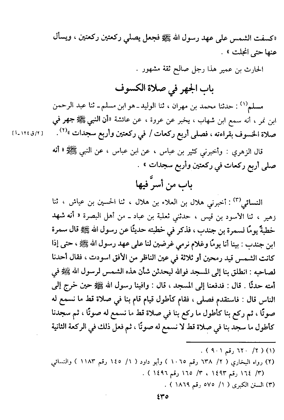 مُسلم: حَدثنَا مُحَمَّد بن مهْرَان، ثَنَا الْوَلِيد - هُوَ ابْن مُسلم - ثَنَا عبد الرَّحْمَن ابْن نمير، أَنه سمع ابْن شهَاب، يخبر عَن عُرْوَة، عَن عَائِشَة " أَن النَّبِي - صَلَّى اللَّهُ عَلَيْهِ وَسَلَّم َ - جهر فِي صَلَاة الخسوف بقرَاءَته، فصلى أَربع رَكْعَات / فِي رَكْعَتَيْنِ وَأَرْبع سَجدَات ".