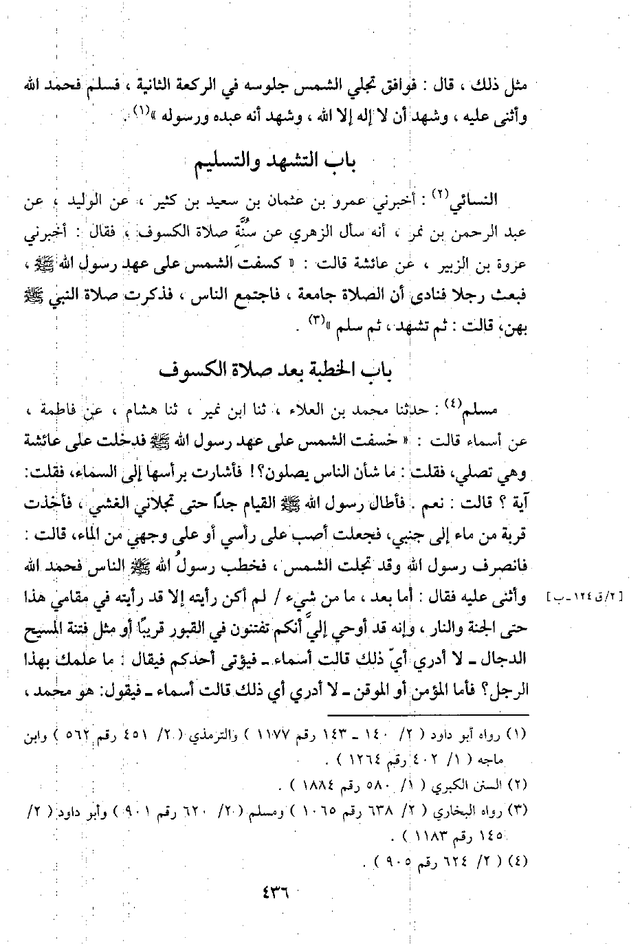 مُسلم: حَدثنَا مُحَمَّد بن الْعَلَاء، ثَنَا ابْن نمير، ثَنَا هِشَام، عَن فَاطِمَة، عَن أَسمَاء قَالَت: " خسفت الشَّمْس على عهد رَسُول الله - صَلَّى اللَّهُ عَلَيْهِ وَسَلَّم َ - فَدخلت على عَائِشَة وَهِي تصلي، فَقلت: مَا شَأْن النَّاس يصلونَ؟ ! فَأَشَارَتْ برأسها إِلَى السَّمَاء، فَقلت: آيَة؟ قَالَت: نعم. فَأطَال رَسُول الله - صَلَّى اللَّهُ عَلَيْهِ وَسَلَّم َ - الْقيام جدا حَتَّى تجلاني الغشي، فَأخذت قربَة من مَاء إِلَى جَنْبي، فَجعلت أصب على رَأْسِي أَو على وَجْهي من المَاء، قَالَت: فَانْصَرف رَسُول الله وَقد تجلت الشَّمْس، فَخَطب رَسُول الله - صَلَّى اللَّهُ عَلَيْهِ وَسَلَّم َ - النَّاس فَحَمدَ الله وَأثْنى عَلَيْهِ فَقَالَ: أما بعد، مَا من شَيْء / لم أكن رَأَيْته إِلَّا قد رَأَيْته فِي مقَامي هَذَا حَتَّى الْجنَّة وَالنَّار، وَإنَّهُ قد أُوحِي إِلَيّ أَنكُمْ تفتنون فِي الْقُبُور قَرِيبا أَو مثل فتْنَة الْمَسِيح الدَّجَّال - لَا أَدْرِي أَي ذَلِك قَالَت أَسمَاء - فَيُؤتى أحدكُم فَيُقَال: مَا علمك بِهَذَا الرجل؟ فَأَما الْمُؤمن أَو الموقن - لَا أَدْرِي أَي ذَلِك قَالَت أَسمَاء - فَيَقُول: هُوَ مُحَمَّد،