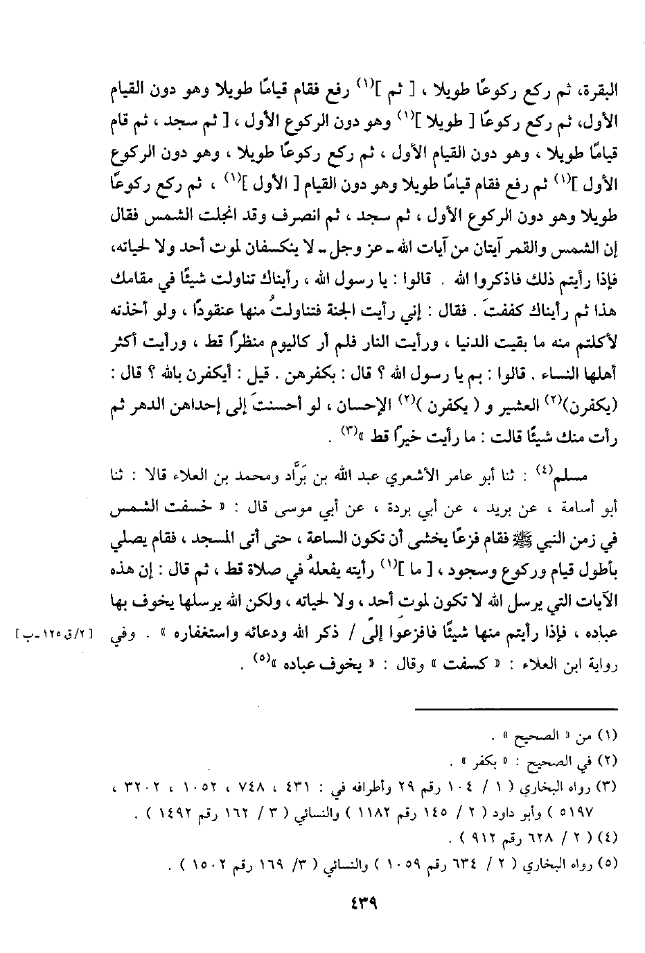 مُسلم: ثَنَا أَبُو عَامر الْأَشْعَرِيّ عبد الله بن براد وَمُحَمّد بن الْعَلَاء قَالَا: ثَنَا أَبُو أُسَامَة، عَن بريد، عَن أبي بردة، عَن أبي مُوسَى قَالَ: " خسفت الشَّمْس فِي زمن النَّبِي - صَلَّى اللَّهُ عَلَيْهِ وَسَلَّم َ - فَقَامَ فَزعًا يخْشَى أَن تكون السَّاعَة، حَتَّى أَتَى الْمَسْجِد، فَقَامَ يُصَلِّي بأطول قيام وركوع وَسُجُود، [مَا] رَأَيْته يَفْعَله فِي صَلَاة قطّ، ثمَّ قَالَ: إِن هَذِه الْآيَات الَّتِي يُرْسل الله لَا تكون لمَوْت أحد، وَلَا لِحَيَاتِهِ، وَلَكِن الله يرسلها يخوف بهَا عباده، فَإِذا رَأَيْتُمْ مِنْهَا شَيْئا فافزعوا إِلَى / ذكر الله ودعائه واستغفاره ". وَفِي رِوَايَة ابْن الْعَلَاء: " كسفت " وَقَالَ: " يخوف عباده ".