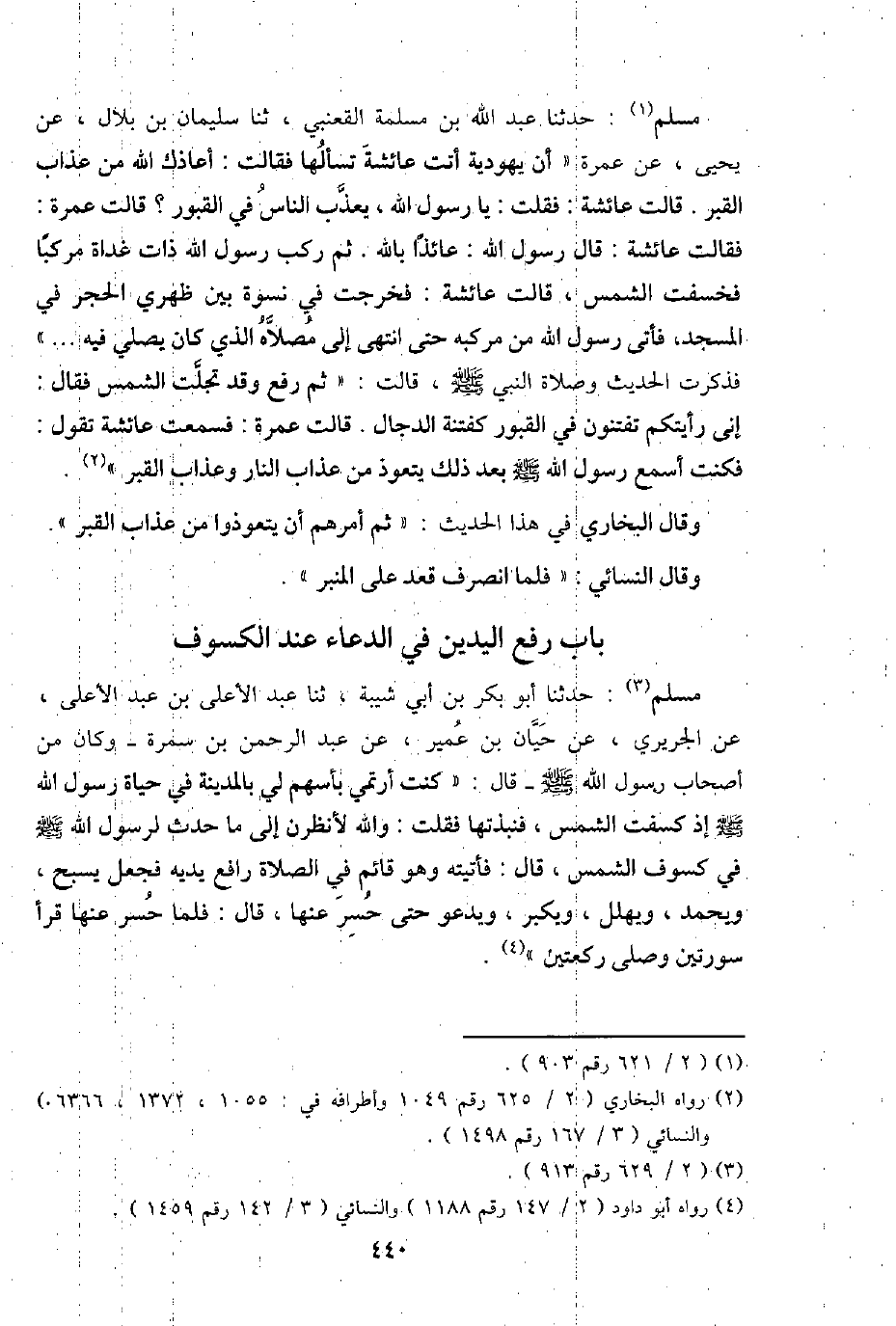 مُسلم: حَدثنَا عبد الله بن مسلمة القعْنبِي، ثَنَا سُلَيْمَان بن بِلَال، عَن يحيى، عَن عمْرَة " أَن يَهُودِيَّة أَتَت عَائِشَة تسألها فَقَالَت: أَعَاذَك الله من عَذَاب الْقَبْر. قَالَت عَائِشَة: فَقلت: يَا رَسُول الله، يعذب النَّاس فِي الْقُبُور؟ قَالَت عمْرَة: فَقَالَت عَائِشَة: قَالَ رَسُول الله: عائذا بِاللَّه. ثمَّ ركب رَسُول الله ذَات غَدَاة مركبا فخسفت الشَّمْس، قَالَت عَائِشَة: فَخرجت فِي نسْوَة بَين ظَهْري الْحجر فِي الْمَسْجِد، فَأتى رَسُول الله من مركبه حَتَّى انْتهى إِلَى مُصَلَّاهُ الَّذِي كَانَ يُصَلِّي فِيهِ ... . " فَذكرت الحَدِيث وَصَلَاة النَّبِي - صَلَّى اللَّهُ عَلَيْهِ وَسَلَّم َ -، قَالَت: " ثمَّ رفع وَقد تجلت الشَّمْس فَقَالَ: إِنِّي رأيتكم تفتنون فِي الْقُبُور كفتنة الدَّجَّال. قَالَت عمْرَة: فَسمِعت عَائِشَة تَقول: فَكنت أسمع رَسُول الله - صَلَّى اللَّهُ عَلَيْهِ وَسَلَّم َ - بعد ذَلِك بتعوذ من عَذَاب النَّار وَعَذَاب الْقَبْر ".
