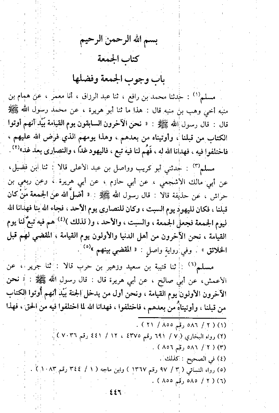 مُسلم: حَدثنَا مُحَمَّد بن رَافع، ثَنَا عبد الرَّزَّاق، أَنا معمر، عَن همام بن مُنَبّه أخي وهب بن مُنَبّه قَالَ: هَذَا مَا ثَنَا أَبُو هُرَيْرَة، عَن مُحَمَّد رَسُول الله - صَلَّى اللَّهُ عَلَيْهِ وَسَلَّم َ - قَالَ: قَالَ رَسُول الله - صَلَّى اللَّهُ عَلَيْهِ وَسَلَّم َ -: " نَحن الْآخرُونَ السَّابِقُونَ يَوْم الْقِيَامَة بيد أَنهم أُوتُوا الْكتاب من قبلنَا، وأوتيناه من بعدهمْ، وَهَذَا يومهم الَّذِي فرض الله عَلَيْهِم، فَاخْتَلَفُوا فِيهِ، فهدانا الله لَهُ، فهم لنا فِيهِ تبع، فاليهود غَدا، وَالنَّصَارَى بعد غَد ".