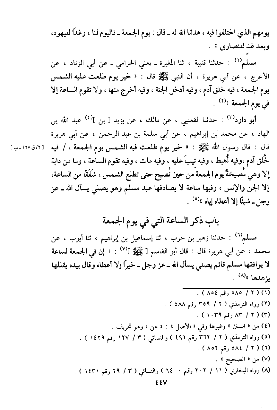 مُسلم: حَدثنَا قُتَيْبَة، ثَنَا الْمُغيرَة - يَعْنِي الْحزَامِي - عَن أبي الزِّنَاد، عَن الْأَعْرَج، عَن أبي هُرَيْرَة، أَن النَّبِي - صَلَّى اللَّهُ عَلَيْهِ وَسَلَّم َ - قَالَ: " خير يَوْم طلعت عَلَيْهِ الشَّمْس يَوْم الْجُمُعَة، فِيهِ خلق آدم، وَفِيه أَدخل الْجنَّة، وَفِيه أخرج مِنْهَا، وَلَا تقوم السَّاعَة إِلَّا فِي يَوْم الْجُمُعَة ".