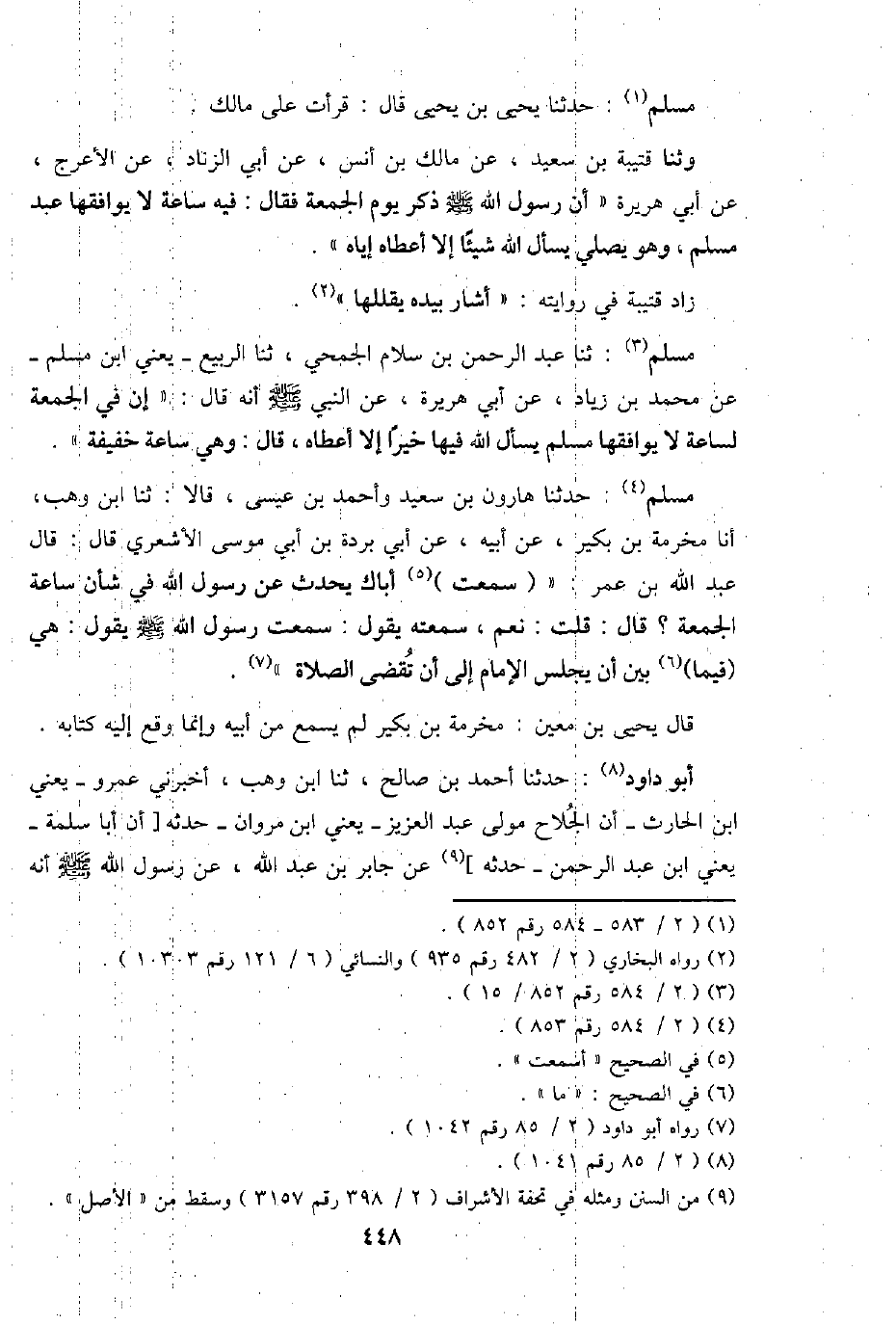 وثنا قُتَيْبَة بن سعيد، عَن مَالك بن أنس، عَن أبي الزِّنَاد، عَن الْأَعْرَج، عَن أبي هُرَيْرَة " أَن رَسُول الله - صَلَّى اللَّهُ عَلَيْهِ وَسَلَّم َ - ذكر يَوْم الْجُمُعَة فَقَالَ: فِيهِ سَاعَة لَا يُوَافِقهَا عبد مُسلم، وَهُوَ يُصَلِّي يسْأَل الله شَيْئا إِلَّا أعطَاهُ إِيَّاه ".