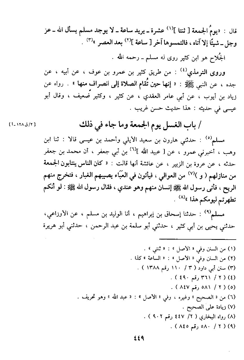 مُسلم: حَدثنِي هَارُون بن سعيد الْأَيْلِي وَأحمد بن عِيسَى قَالَا: ثَنَا ابْن وهب، أَخْبرنِي عَمْرو، عَن [عبيد الله] بن أبي جَعْفَر، أَن مُحَمَّد بن جَعْفَر حَدثهُ، عَن عُرْوَة بن الزبير، عَن عَائِشَة أَنَّهَا قَالَت: " كَانَ النَّاس ينتابون الْجُمُعَة من مَنَازِلهمْ (و) من العوالي، فَيَأْتُونَ فِي العباء يصيبهم الْغُبَار، فَتخرج مِنْهُم الرّيح، فَأتى رَسُول الله - صَلَّى اللَّهُ عَلَيْهِ وَسَلَّم َ - إِنْسَان مِنْهُم وَهُوَ عِنْدِي، فَقَالَ رَسُول الله - صَلَّى اللَّهُ عَلَيْهِ وَسَلَّم َ -: لَو أَنكُمْ تطهرتم ليومكم هَذَا ".