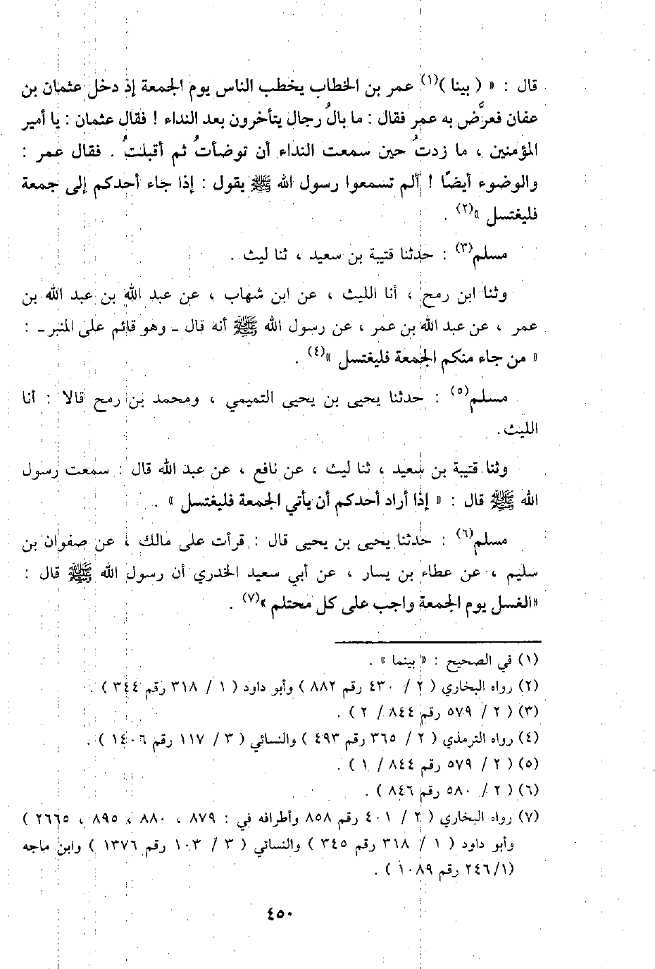 مُسلم: حَدثنَا يحيى بن يحيى قَالَ: قَرَأت على مَالك، عَن صَفْوَان بن سليم، عَن عَطاء بن يسَار، عَن أبي سعيد الْخُدْرِيّ أَن رَسُول الله - صَلَّى اللَّهُ عَلَيْهِ وَسَلَّم َ - قَالَ: " الْغسْل يَوْم الْجُمُعَة وَاجِب على كل محتلم ".