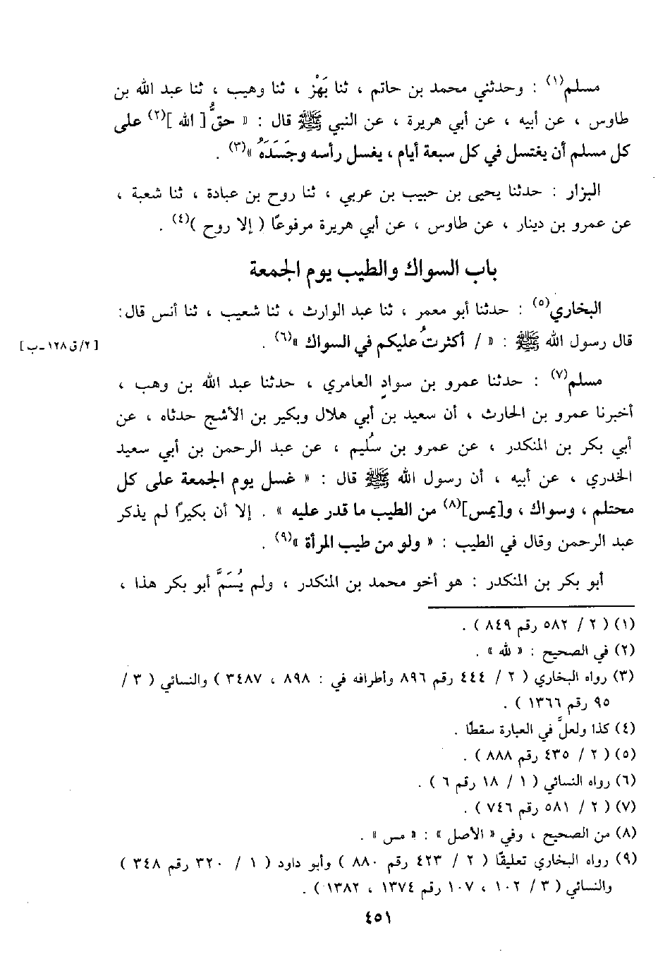 مُسلم: وحَدثني مُحَمَّد بن حَاتِم، ثَنَا بهز، ثَنَا وهيب، ثَنَا عبد الله بن طَاوس، عَن أَبِيه، عَن أبي هُرَيْرَة، عَن النَّبِي - صَلَّى اللَّهُ عَلَيْهِ وَسَلَّم َ - قَالَ: " حق [الله] على كل مُسلم أَن يغْتَسل فِي كل سَبْعَة أَيَّام، يغسل رَأسه وَجَسَده ".