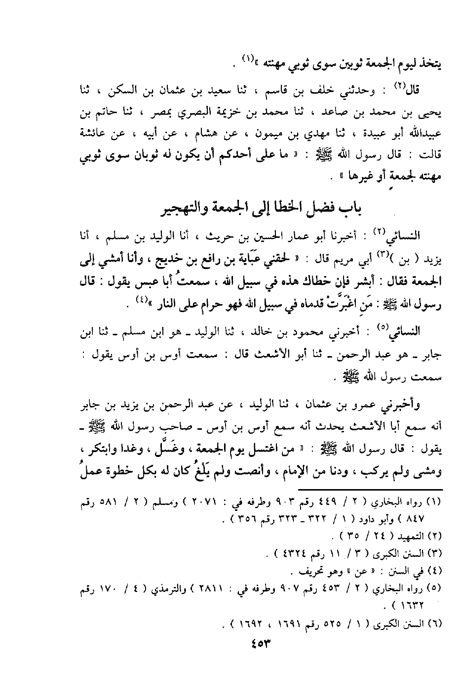 وَأَخْبرنِي عَمْرو بن عُثْمَان، ثَنَا الْوَلِيد، عَن عبد الرَّحْمَن بن يزِيد بن جَابر أَنه سمع أَبَا الْأَشْعَث يحدث أَنه سمع أَوْس بن أَوْس - صَاحب رَسُول الله - صَلَّى اللَّهُ عَلَيْهِ وَسَلَّم َ - يَقُول: قَالَ رَسُول الله - صَلَّى اللَّهُ عَلَيْهِ وَسَلَّم َ -: " من اغْتسل يَوْم الْجُمُعَة، وَغسل، وَغدا وابتكر، وَمَشى وَلم يركب، ودنا من الإِمَام، وأنصت وَلم يلغ كَانَ لَهُ بِكُل خطْوَة عمل
