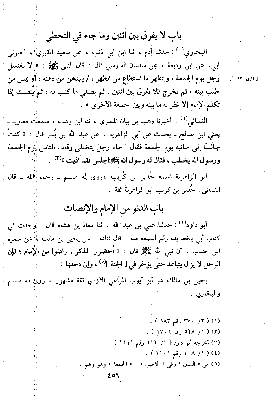 البُخَارِيّ: حَدثنَا آدم، ثَنَا ابْن أبي ذِئْب، عَن سعيد المَقْبُري، أَخْبرنِي أبي، عَن ابْن وَدِيعَة، عَن سلمَان الْفَارِسِي قَالَ: قَالَ النَّبِي - صَلَّى اللَّهُ عَلَيْهِ وَسَلَّم َ -: " لَا يغْتَسل رجل يَوْم الْجُمُعَة، ويتطهر مَا اسْتَطَاعَ من الطُّهْر، / ويدهن من دهنه، أَو يمس من طيب بَيته، ثمَّ يخرج فَلَا يفرق بَين اثْنَيْنِ، ثمَّ يُصَلِّي مَا كتب لَهُ، ثمَّ ينصت إِذا تكلم الإِمَام إِلَّا غفر لَهُ مَا بَينه وَبَين الْجُمُعَة الْأُخْرَى ".