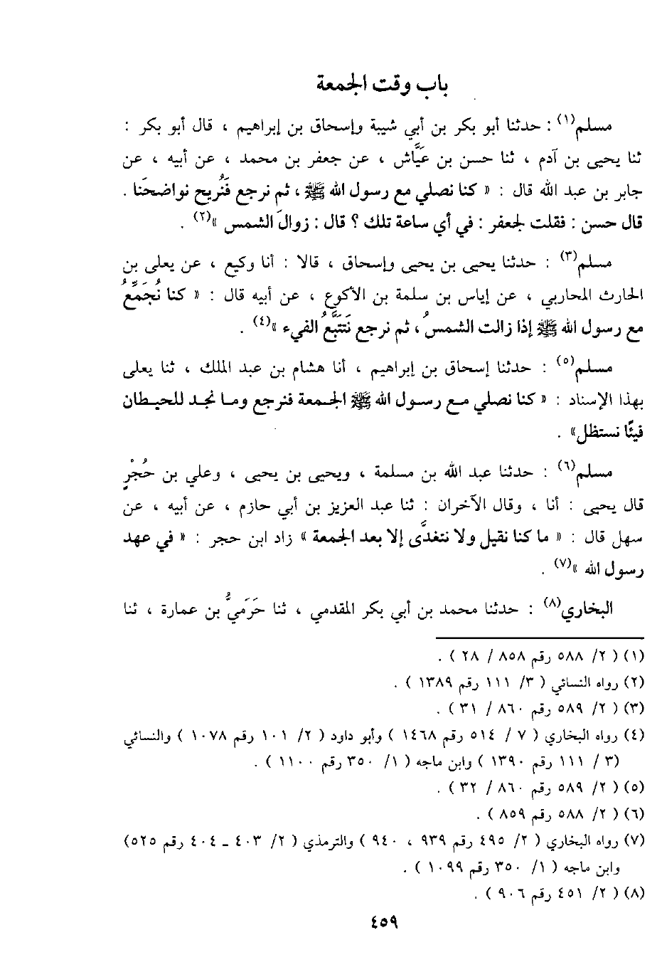 مُسلم: حَدثنَا يحيى بن يحيى وَإِسْحَاق، قَالَا: أَنا وَكِيع، عَن يعلى بن الْحَارِث الْمحَاربي، عَن إِيَاس بن سَلمَة بن الْأَكْوَع، عَن أَبِيه قَالَ: " كُنَّا نجمع مَعَ رَسُول الله - صَلَّى اللَّهُ عَلَيْهِ وَسَلَّم َ - إِذا زَالَت الشَّمْس، ثمَّ نرْجِع نتتبع الْفَيْء ".