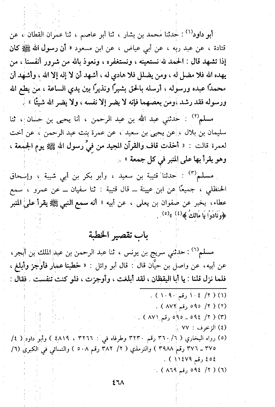 مُسلم: حَدثنِي عبد الله بن عبد الرَّحْمَن، أَنا يحيى بن حسان، ثَنَا سُلَيْمَان بن بِلَال، عَن يحيى بن سعيد، عَن عمْرَة بنت عبد الرَّحْمَن، عَن أُخْت لعمرة قَالَت: " أخذت قَاف وَالْقُرْآن الْمجِيد من فِي رَسُول الله - صَلَّى اللَّهُ عَلَيْهِ وَسَلَّم َ - يَوْم الْجُمُعَة، وَهُوَ يقْرَأ بهَا على الْمِنْبَر فِي كل جُمُعَة ".