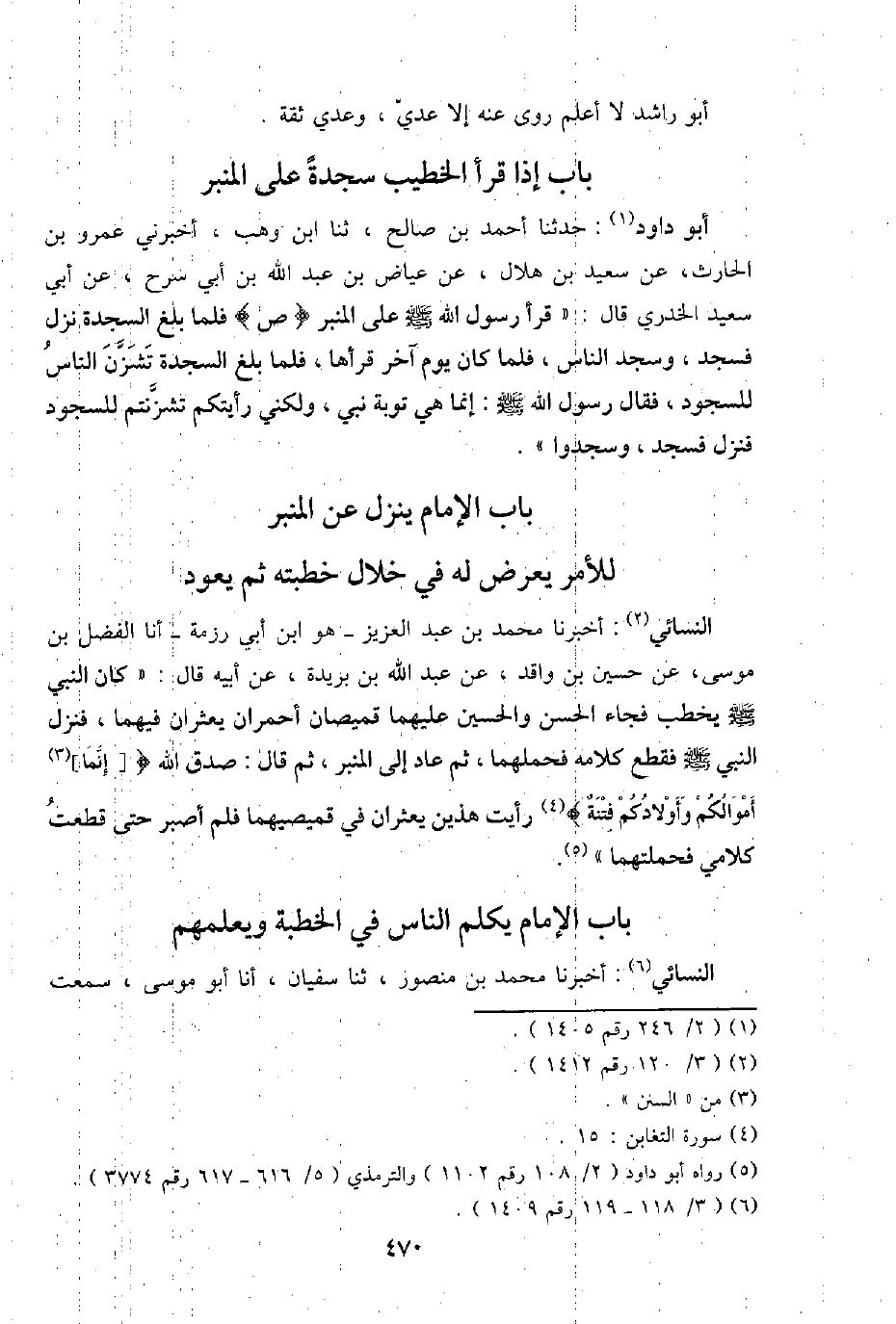 أَبُو دَاوُد: حَدثنَا أَحْمد بن صَالح، ثَنَا ابْن وهب، أَخْبرنِي عَمْرو بن الْحَارِث، عَن سعيد بن هِلَال، عَن عِيَاض بن عبد الله بن أبي سرح، عَن أبي سعيد الْخُدْرِيّ قَالَ: " قَرَأَ رَسُول الله - صَلَّى اللَّهُ عَلَيْهِ وَسَلَّم َ - على الْمِنْبَر {ص} فَلَمَّا بلغ السَّجْدَة نزل فَسجدَ، وَسجد النَّاس، فَلَمَّا كَانَ يَوْم آخر قَرَأَهَا، فَلَمَّا بلغ السَّجْدَة تشزن النَّاس للسُّجُود، فَقَالَ رَسُول الله - صَلَّى اللَّهُ عَلَيْهِ وَسَلَّم َ -: إِنَّمَا هِيَ تَوْبَة نَبِي، وَلَكِنِّي رأيتكم تشزنتم للسُّجُود فَنزل فَسجدَ، وسجدوا ".
