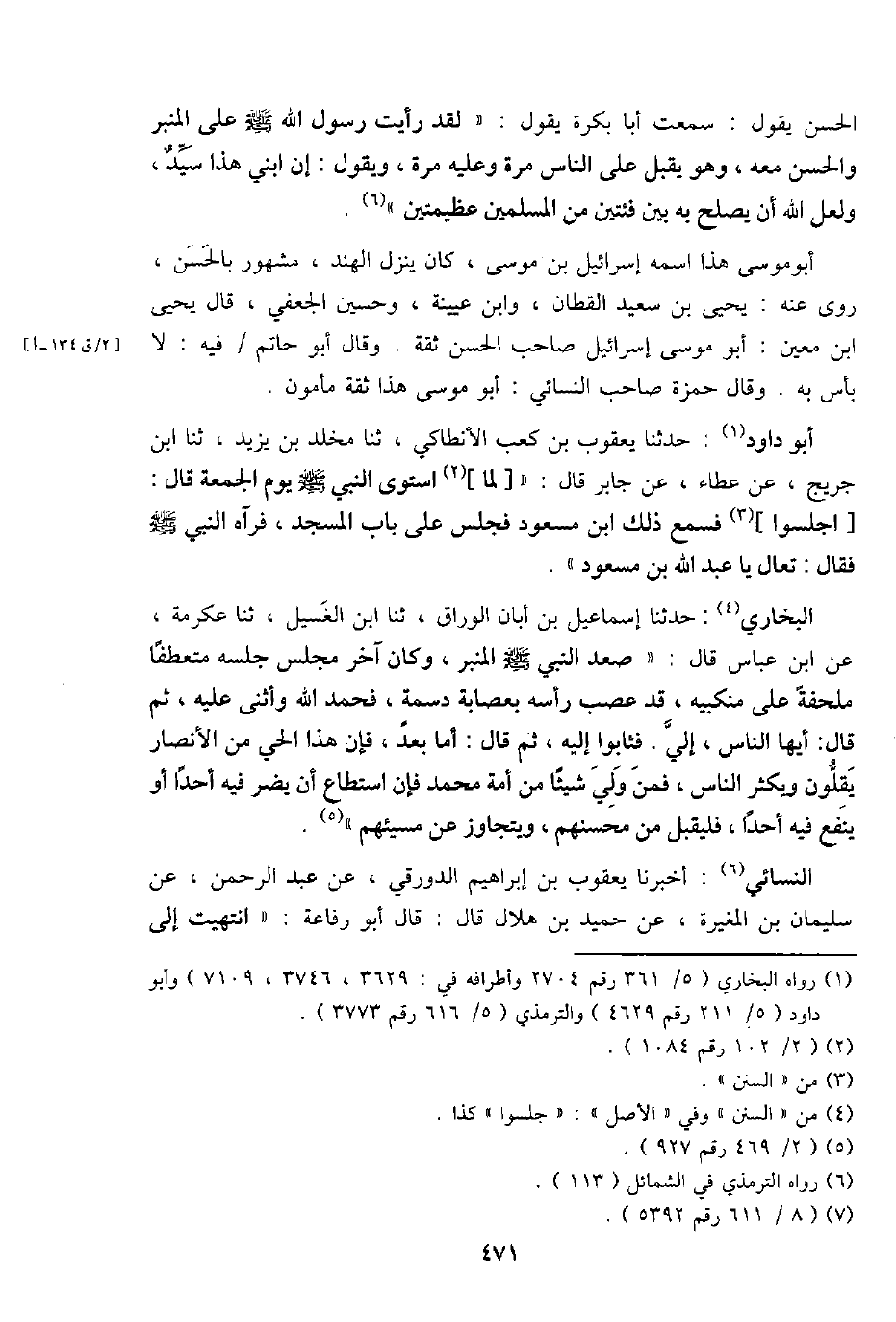 الْحسن يَقُول: سَمِعت أَبَا بكرَة يَقُول: " لقد رَأَيْت رَسُول الله - صَلَّى اللَّهُ عَلَيْهِ وَسَلَّم َ - على الْمِنْبَر وَالْحسن مَعَه، وَهُوَ يقبل على النَّاس، مرّة وَعَلِيهِ مرّة، وَيَقُول: إِن ابْني هَذَا سيد، وَلَعَلَّ الله أَن يصلح بِهِ بَين فئتين من الْمُسلمين عظيمتين ".