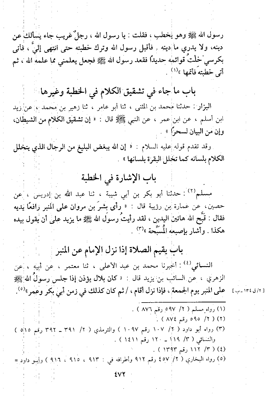 مُسلم: حَدثنَا أَبُو بكر بن أبي شيبَة، ثَنَا عبد الله بن إِدْرِيس، عَن حُصَيْن، عَن عمَارَة بن رؤيبة قَالَ: " رأى بشر بن مَرْوَان على الْمِنْبَر رَافعا يَدَيْهِ فَقَالَ: قبح الله هَاتين الْيَدَيْنِ، لقد رَأَيْت رَسُول الله - صَلَّى اللَّهُ عَلَيْهِ وَسَلَّم َ - مَا يزِيد على أَن يَقُول بِيَدِهِ هَكَذَا. وَأَشَارَ بإصبعه المسبحة ".