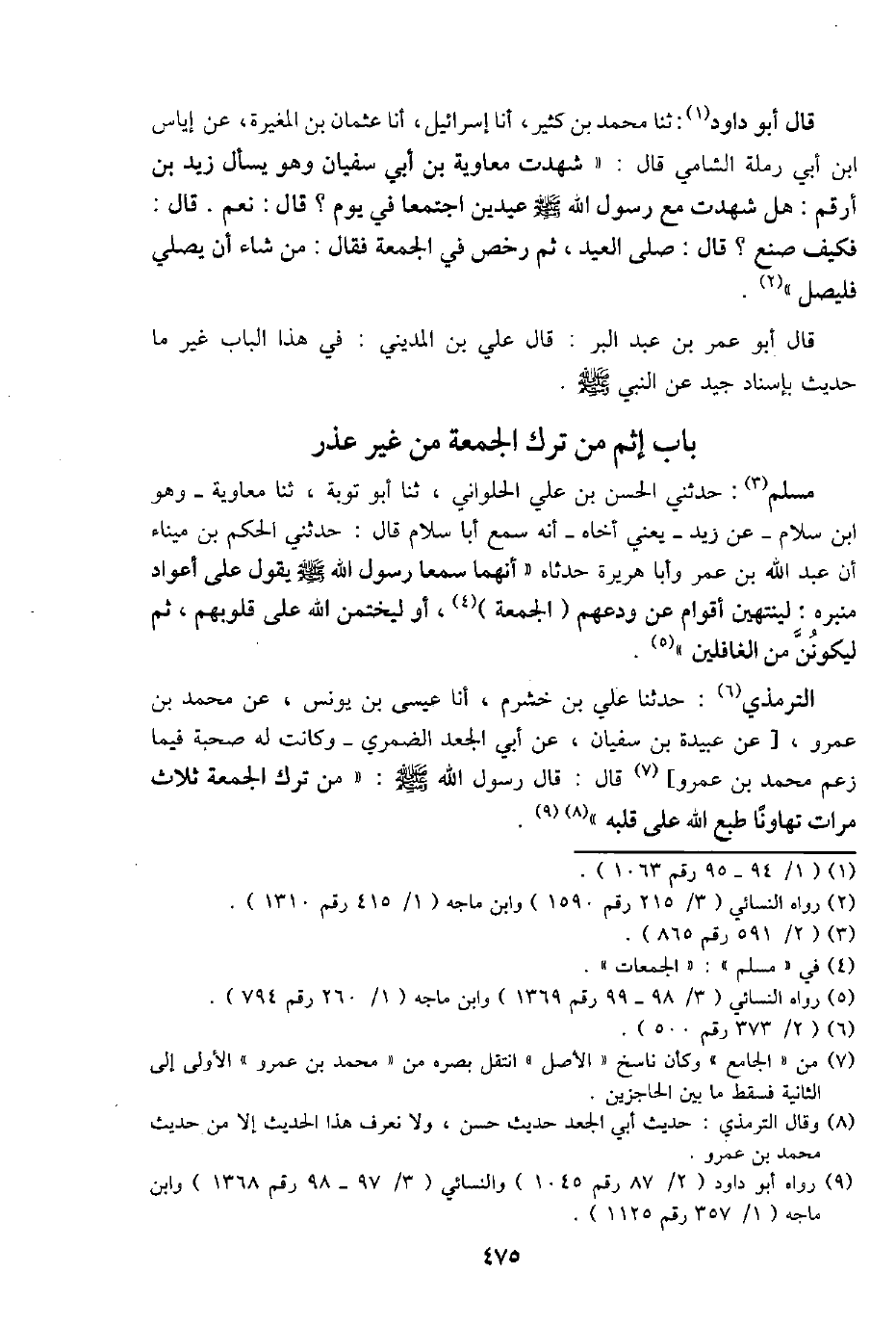 مُسلم: حَدثنِي الْحسن بن عَليّ الْحلْوانِي، ثَنَا أَبُو تَوْبَة، ثَنَا مُعَاوِيَة - وَهُوَ ابْن سَلام - عَن زيد - يَعْنِي أَخَاهُ - أَنه سمع أَبَا سَلام قَالَ: حَدثنِي الحكم بن ميناء أَن عبد الله بن عمر وَأَبا هُرَيْرَة حَدَّثَاهُ " أَنَّهُمَا سمعا رَسُول الله - صَلَّى اللَّهُ عَلَيْهِ وَسَلَّم َ - يَقُول على أَعْوَاد منبره: لينتهين أَقوام عَن ودعهم (الْجُمُعَة) ، أَو ليختمن الله على قُلُوبهم، ثمَّ لَيَكُونن من الغافلين ".