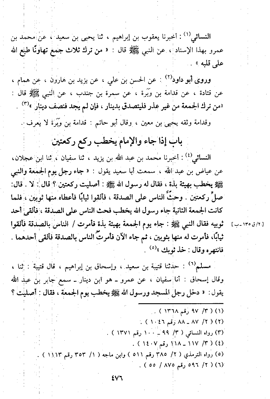 مُسلم: حَدثنَا قُتَيْبَة بن سعيد، وَإِسْحَاق بن إِبْرَاهِيم، قَالَ قُتَيْبَة: ثَنَا، وَقَالَ إِسْحَاق: أَنا سُفْيَان، عَن عَمْرو - هُوَ ابْن دِينَار - سمع جَابر بن عبد الله يَقُول: " دخل رجل الْمَسْجِد وَرَسُول الله - صَلَّى اللَّهُ عَلَيْهِ وَسَلَّم َ - يخْطب يَوْم الْجُمُعَة، فَقَالَ: أصليت؟
